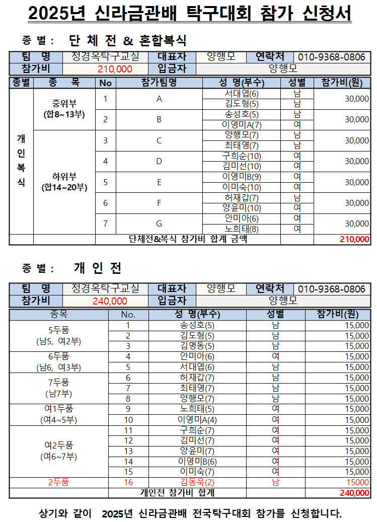 참가비 450,000(복식 210,000 + 개인전 240,000)는 금일중 입금 하겠습니다.