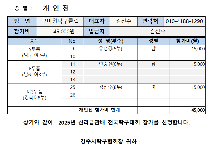 참가 신청(구미 원탁구) 작성자김선주|작성시간25.06.20|조회수93 목록 댓글 1 글자크기 작게가 글자크기 크게가 다음검색 현재 게시글 추가 기능 열기 북마크 공유하기 신고 센터로 신고 댓글 댓글 1 댓글쓰기 답글쓰기 댓글 리스트 작성자FM핑퐁(경탁) | 작성시간 25.06.20 접수확인 하였습니다. 댓글 전체보기