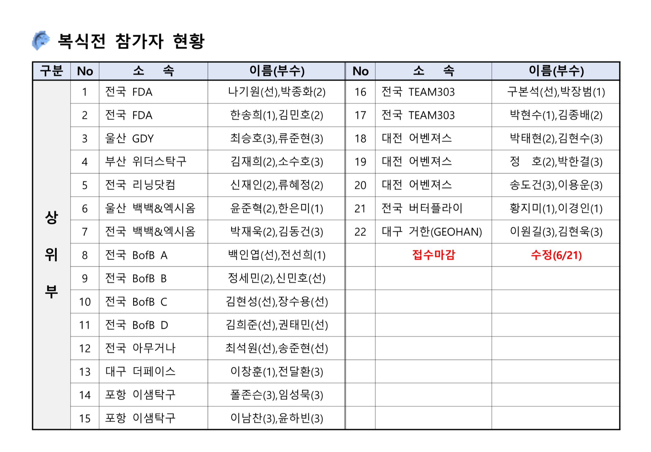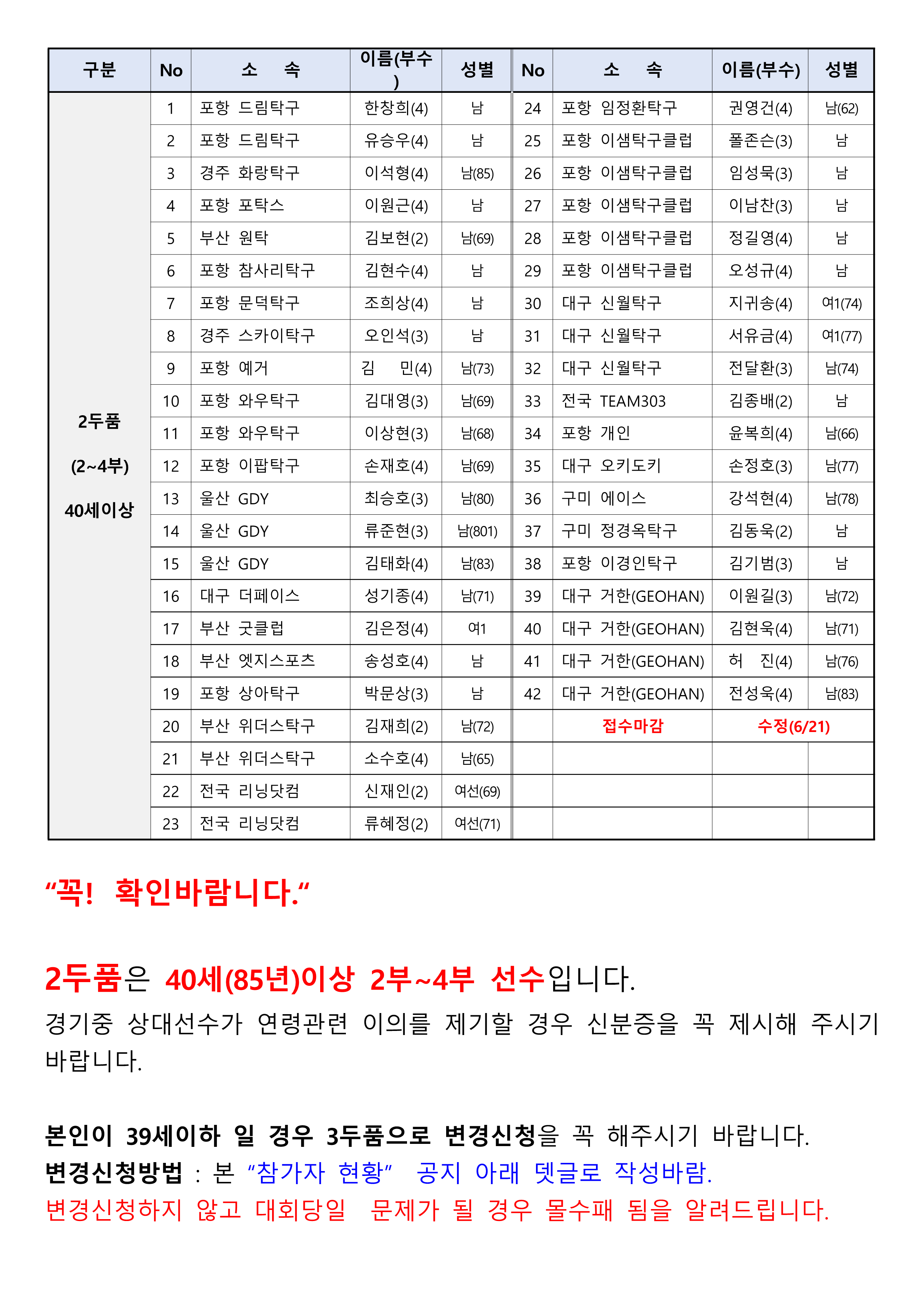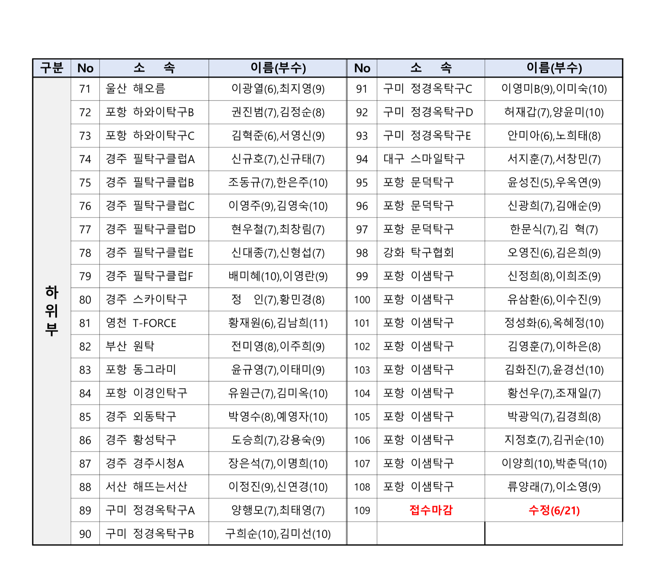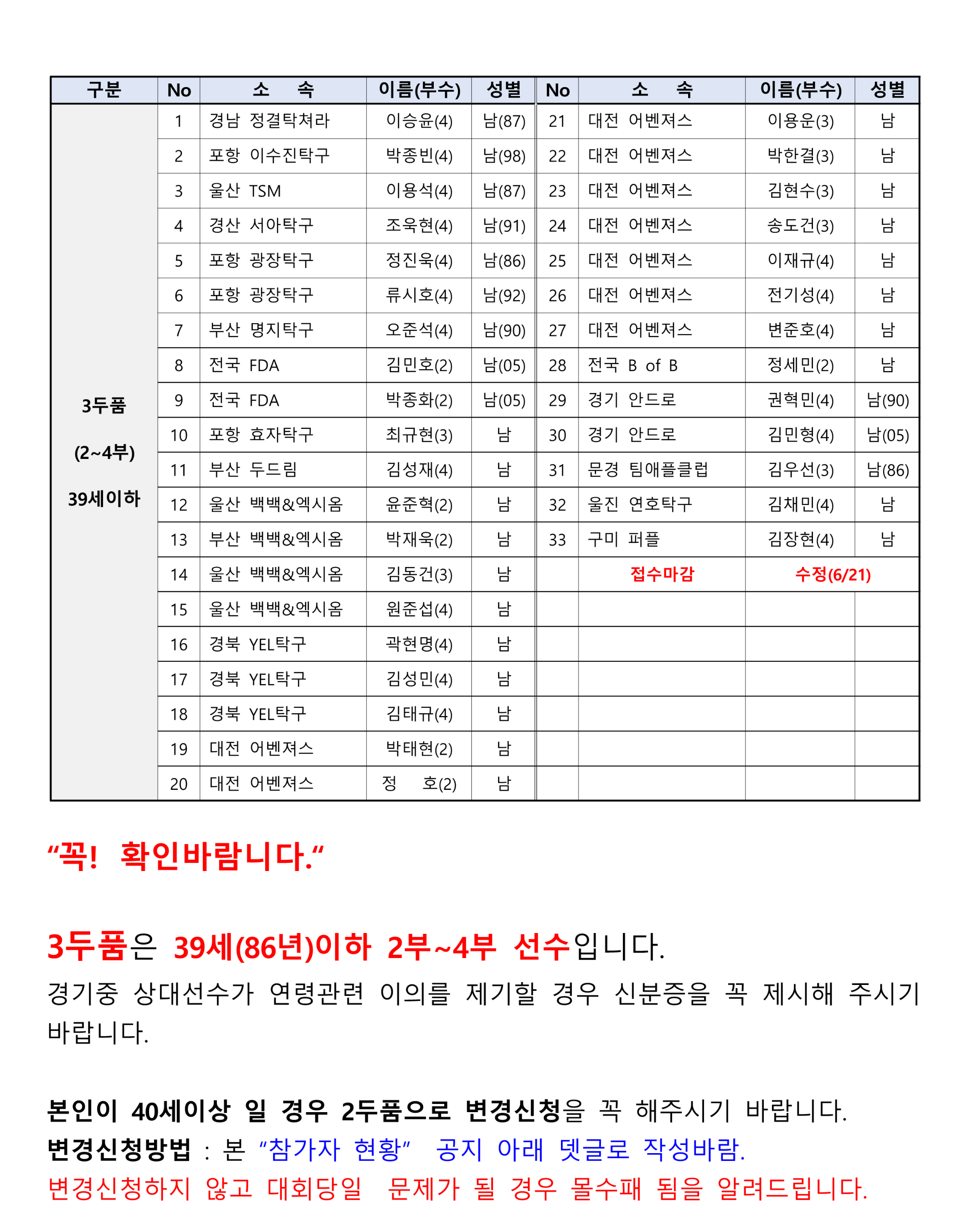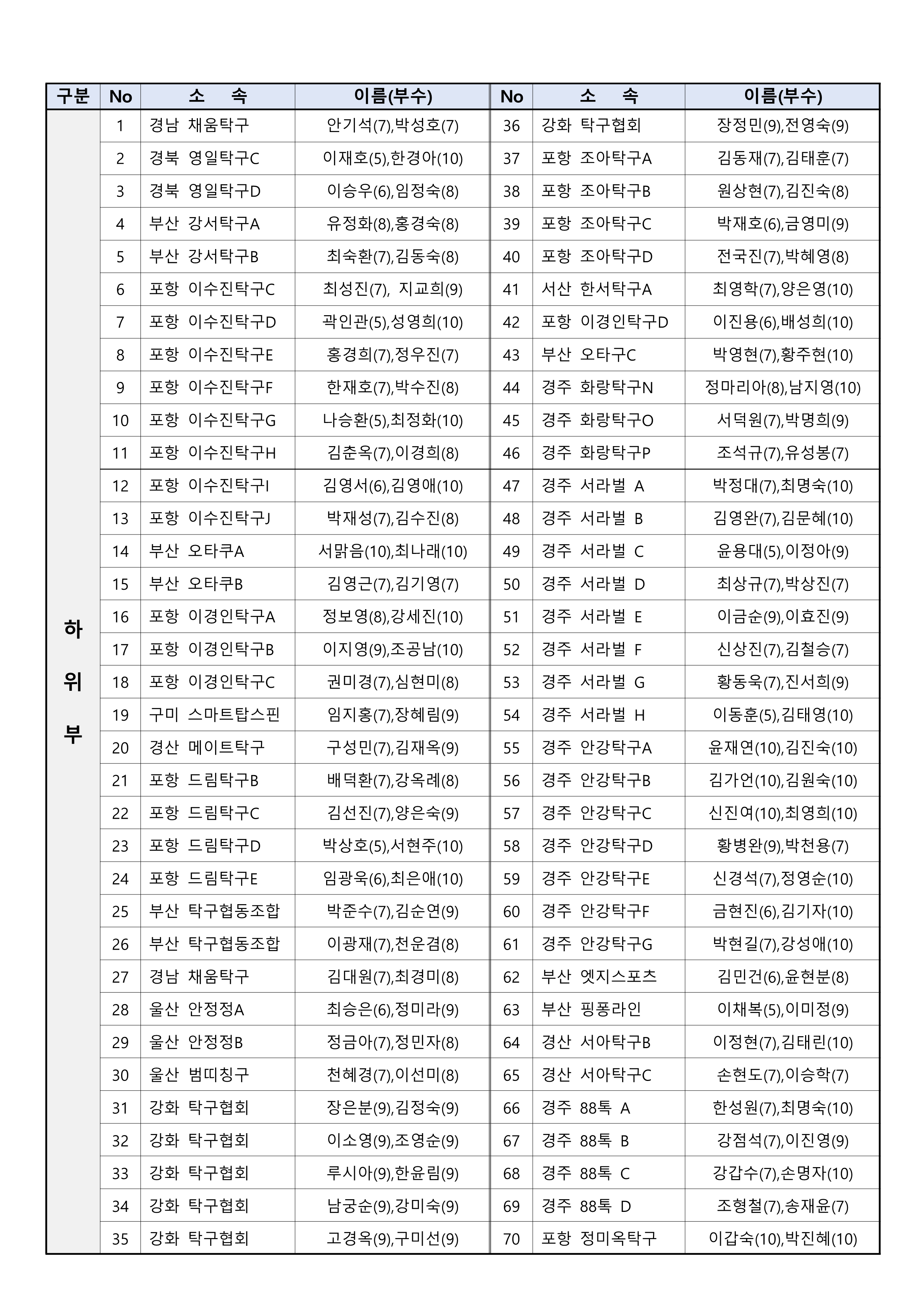 참가선수 명단을 아래와 같이 공지하오니 누락 되신분, 또는 소속, 이름, 부수 등 오류가 있는지 확인해 주시고,