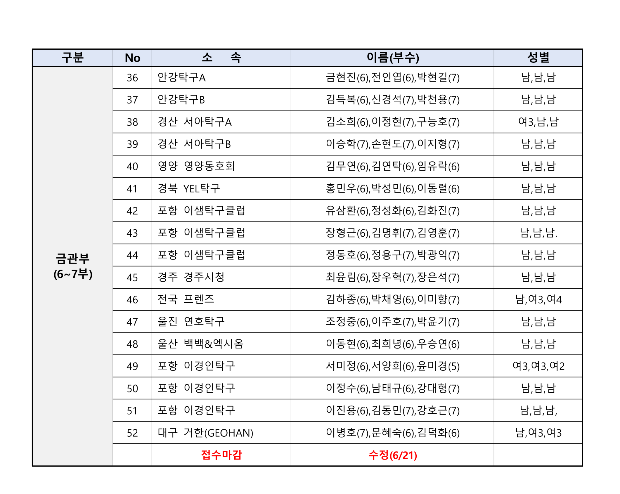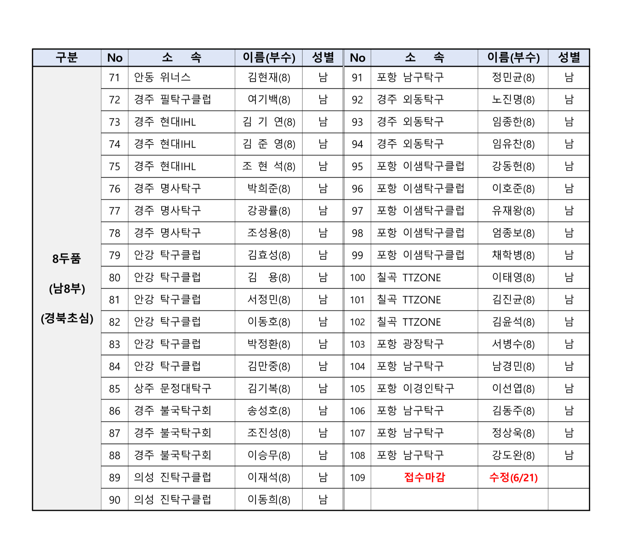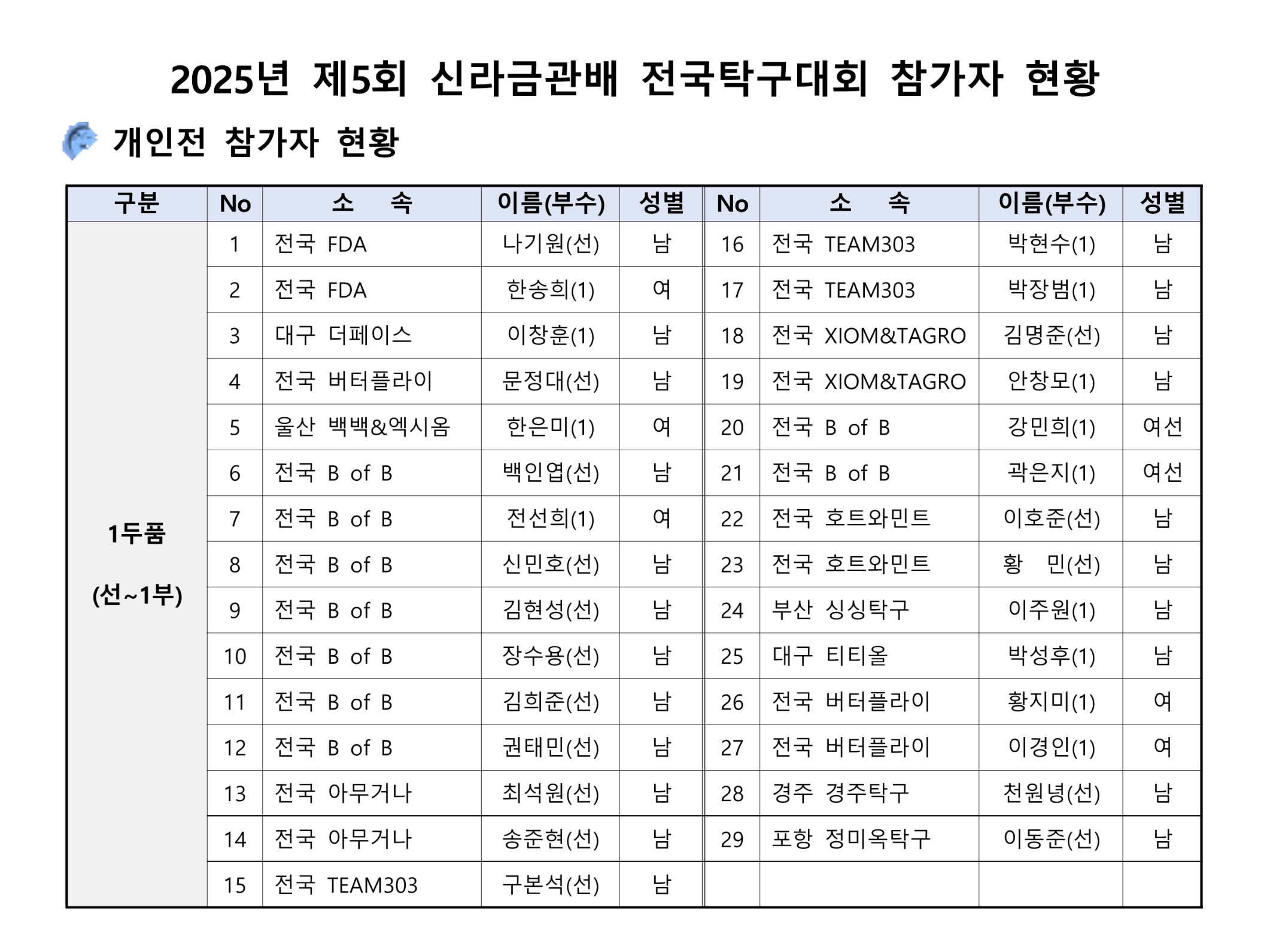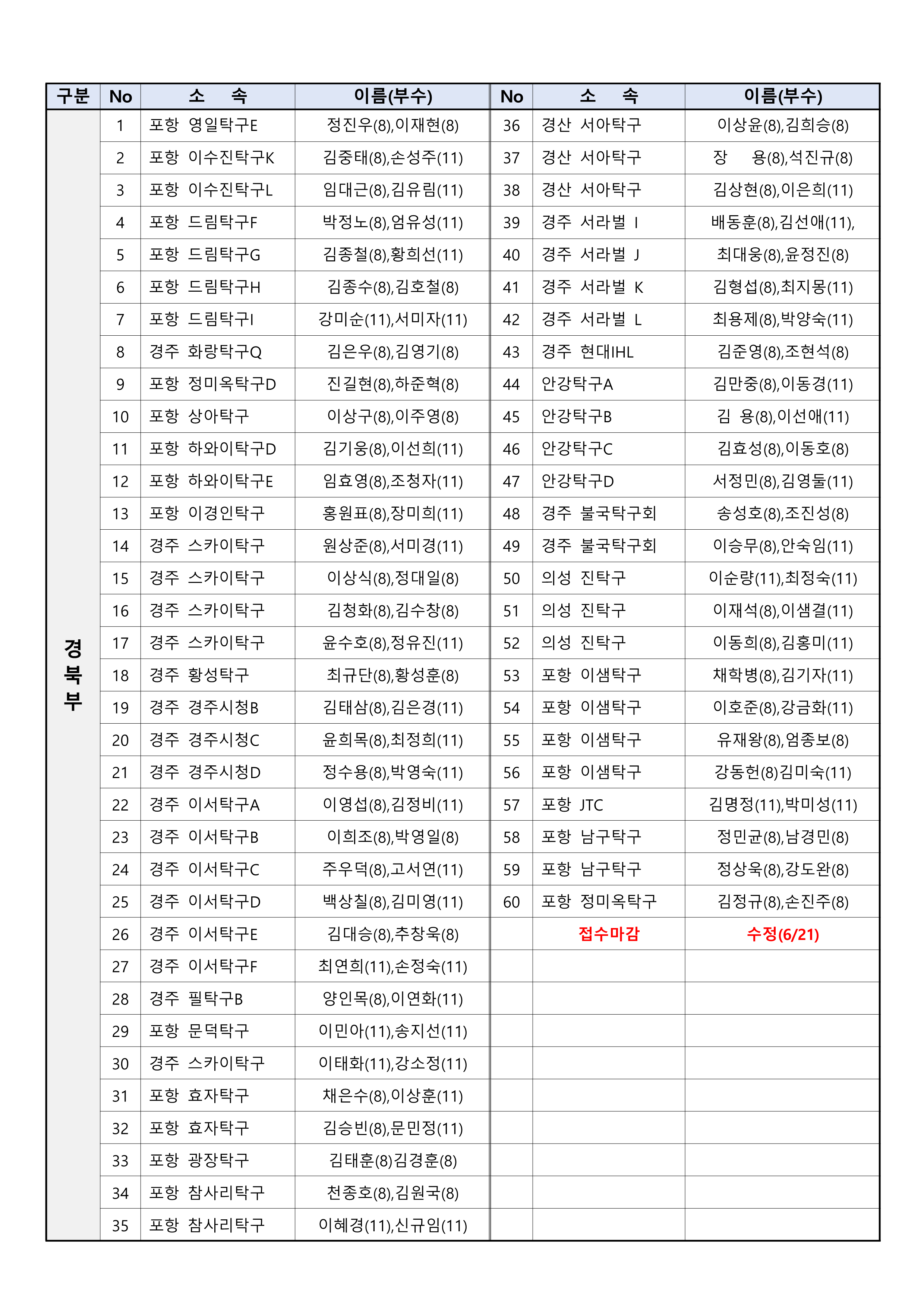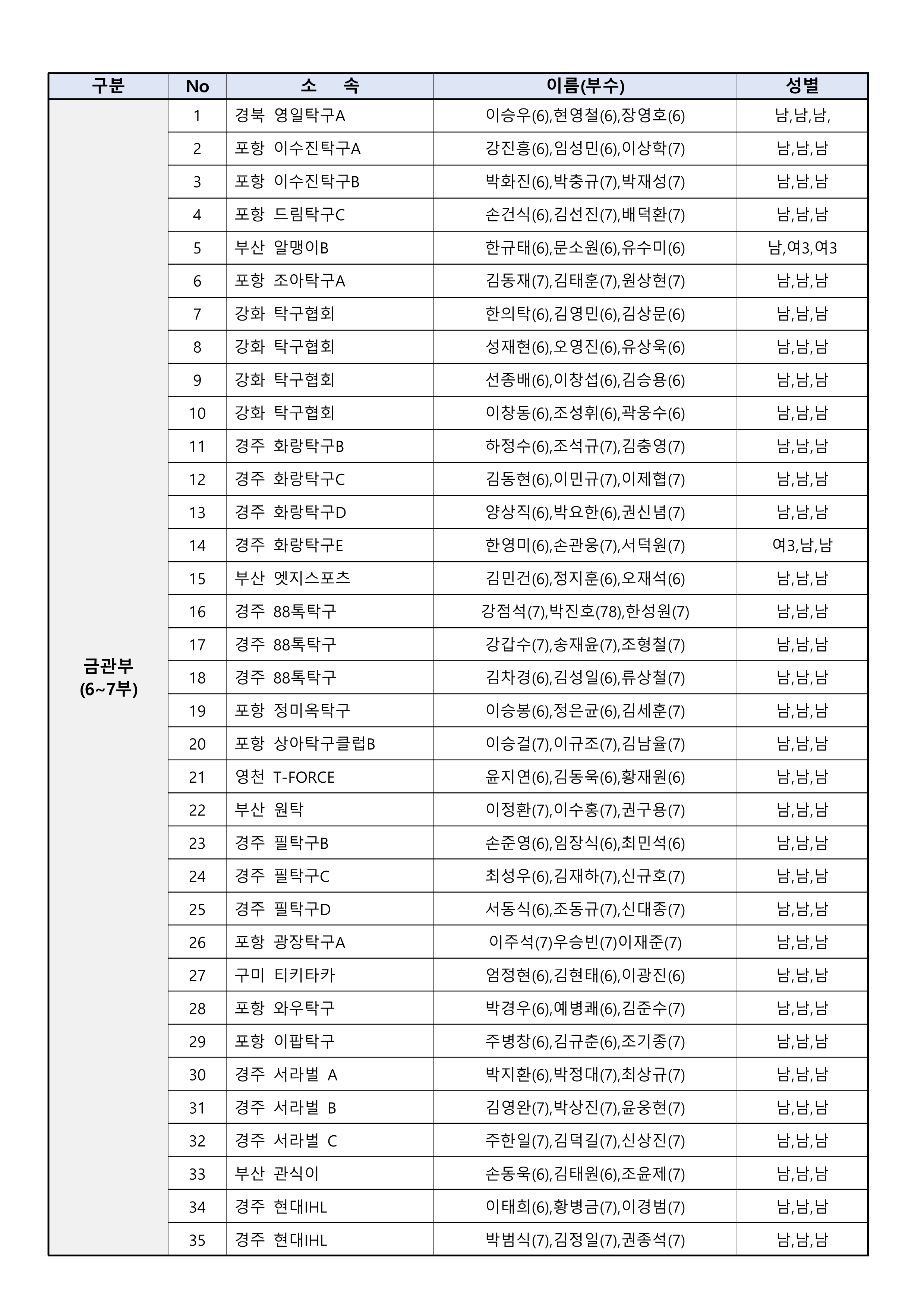 참가선수 명단을 아래와 같이 공지하오니 누락 되신분, 또는 소속, 이름, 부수 등 오류가 있는지 확인해 주시고,