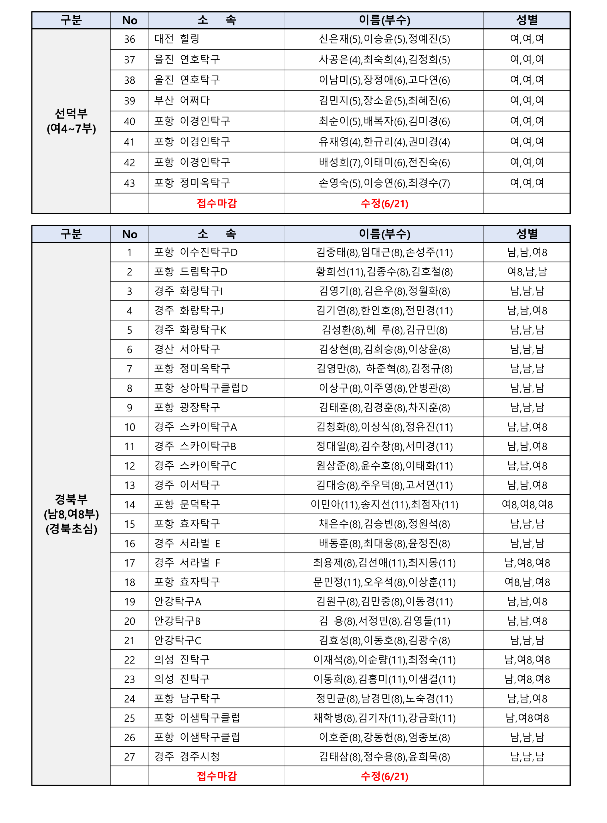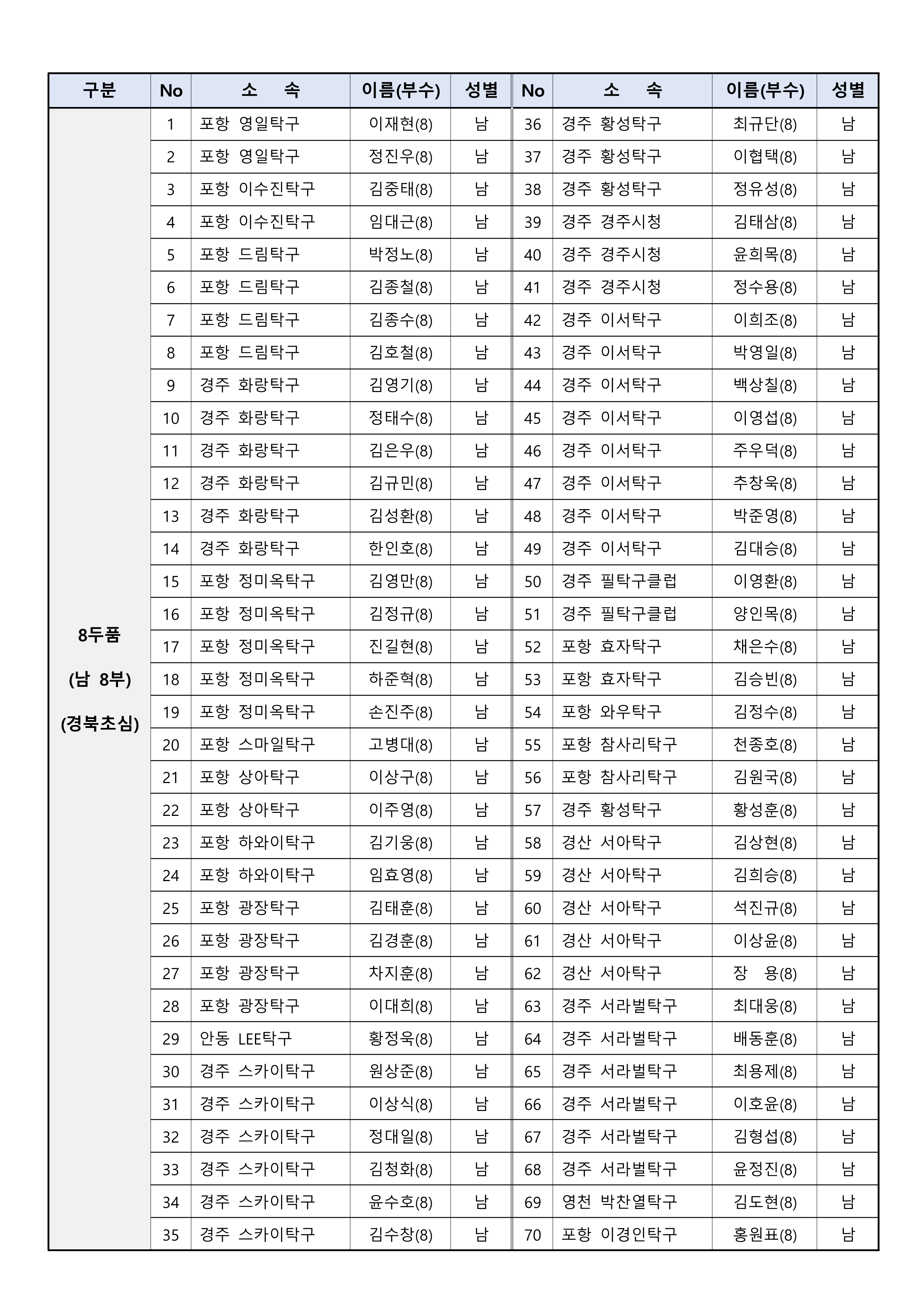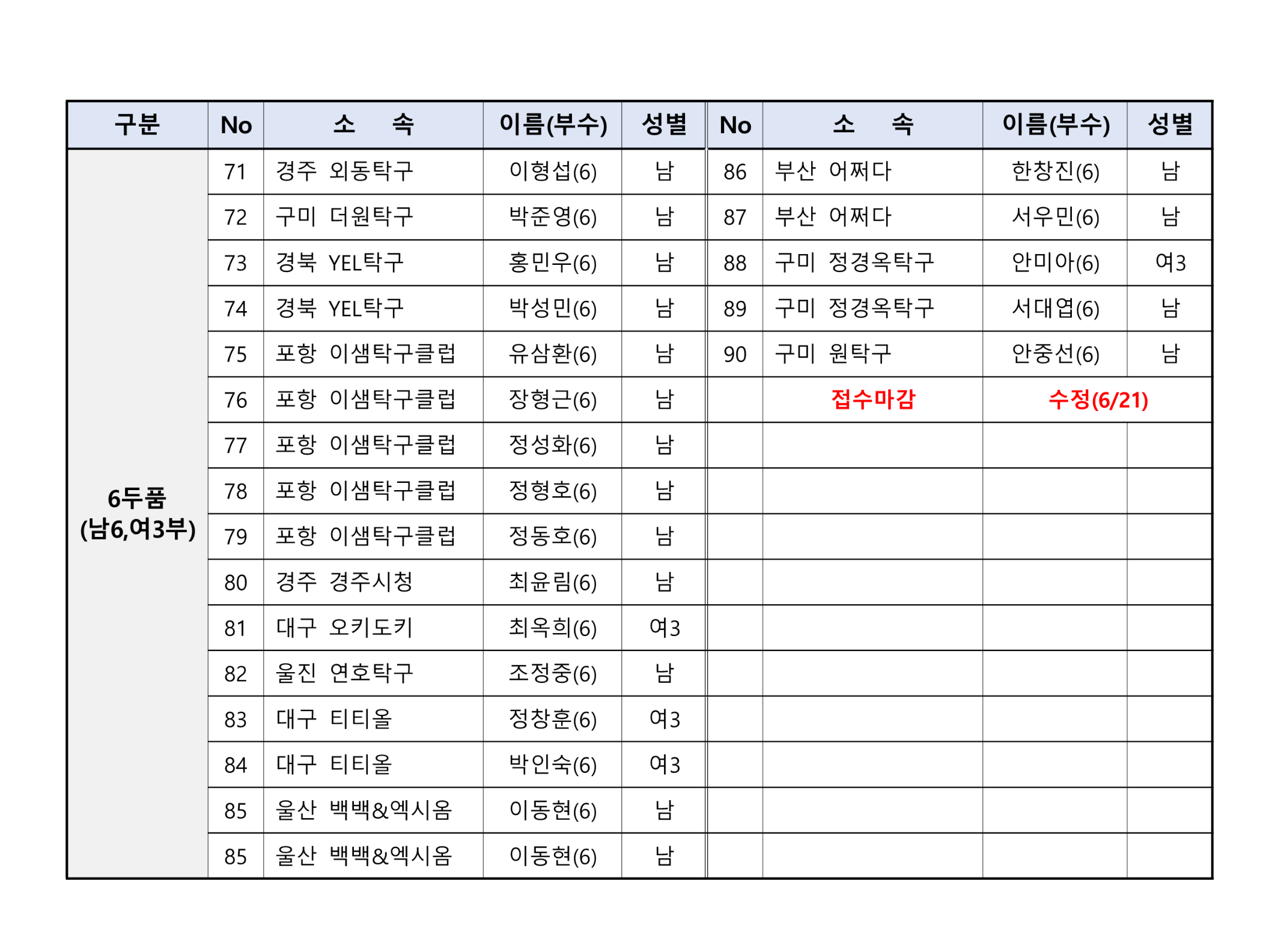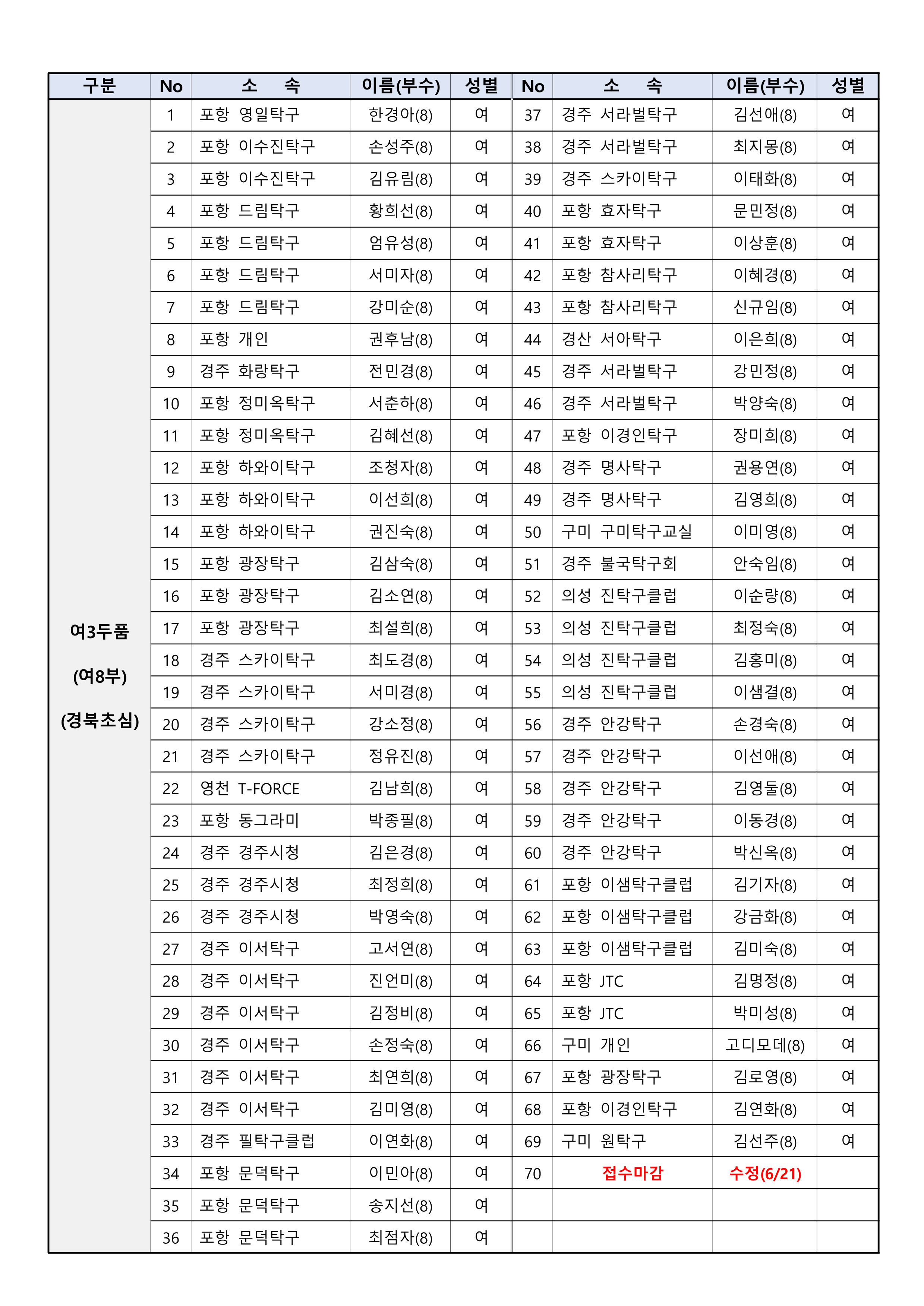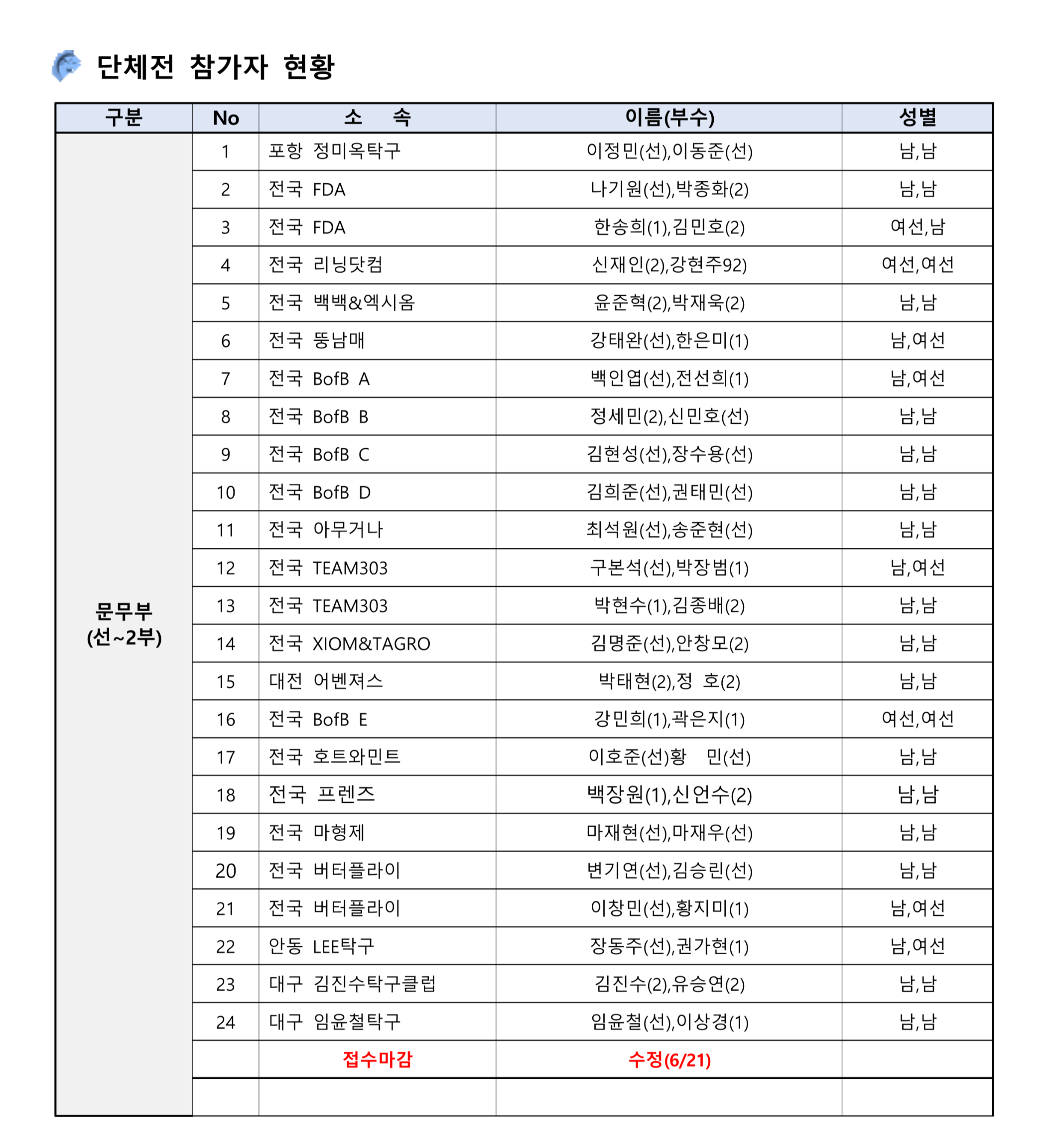 참가선수 명단을 아래와 같이 공지하오니 누락 되신분, 또는 소속, 이름, 부수 등 오류가 있는지 확인해 주시고,