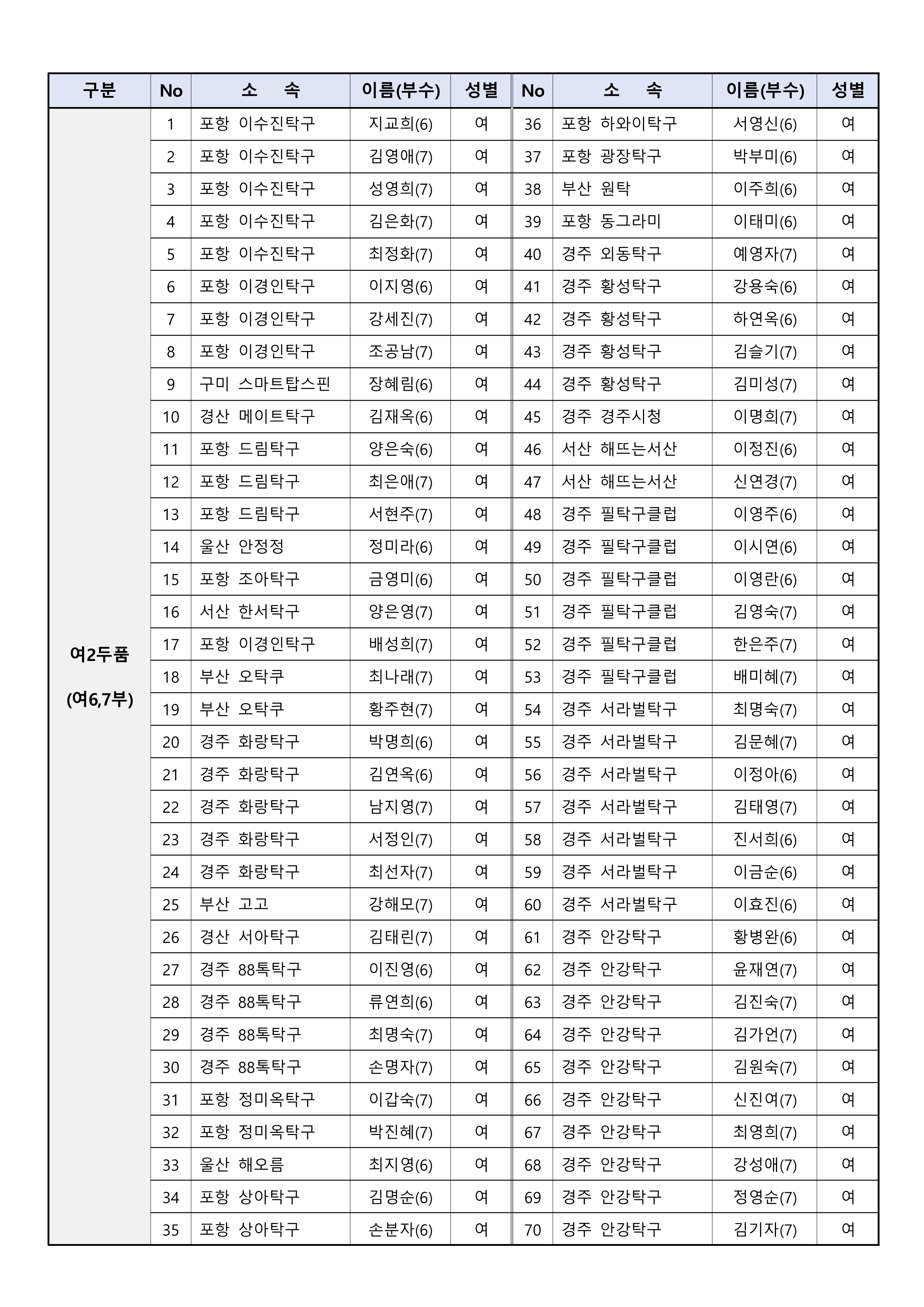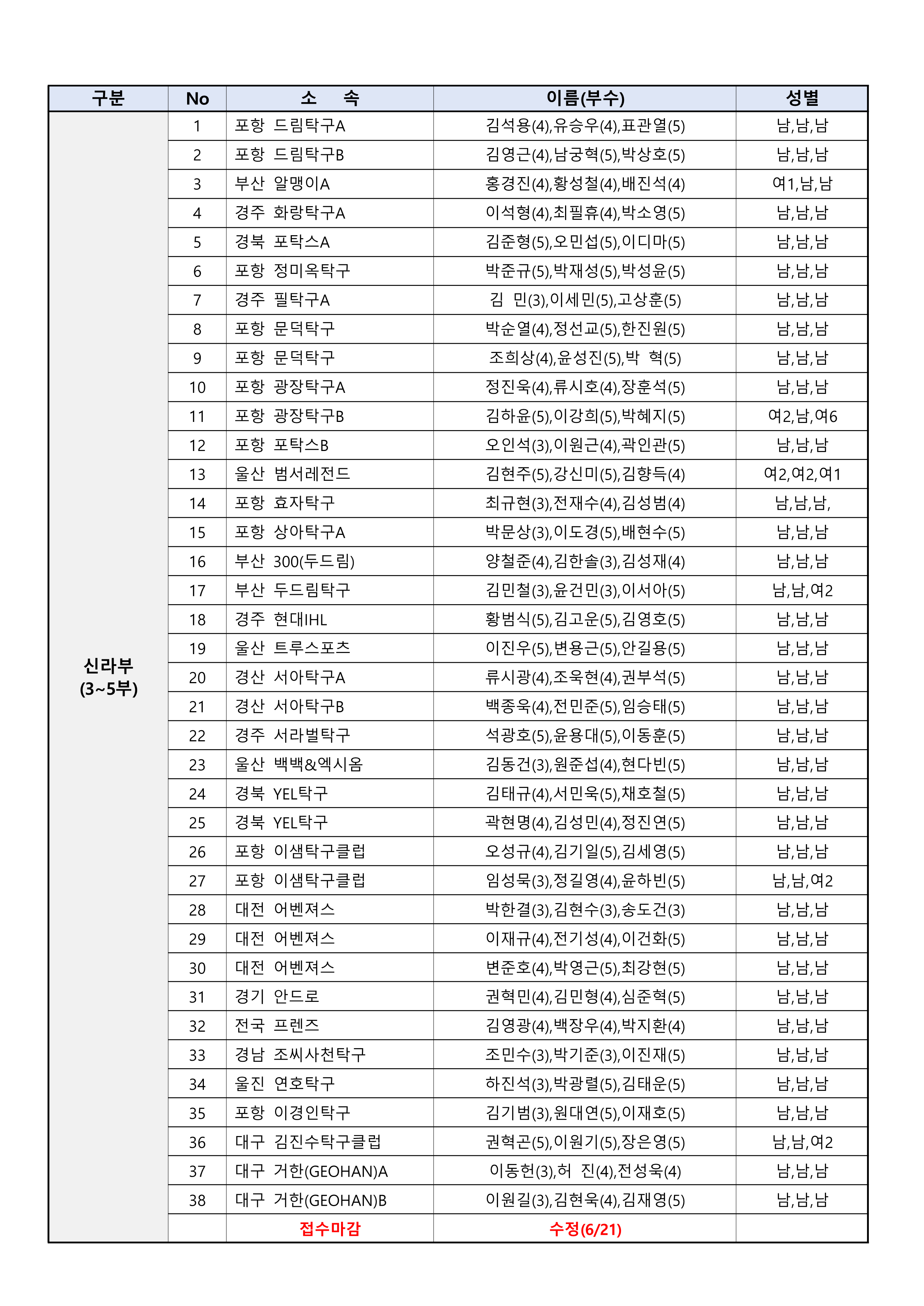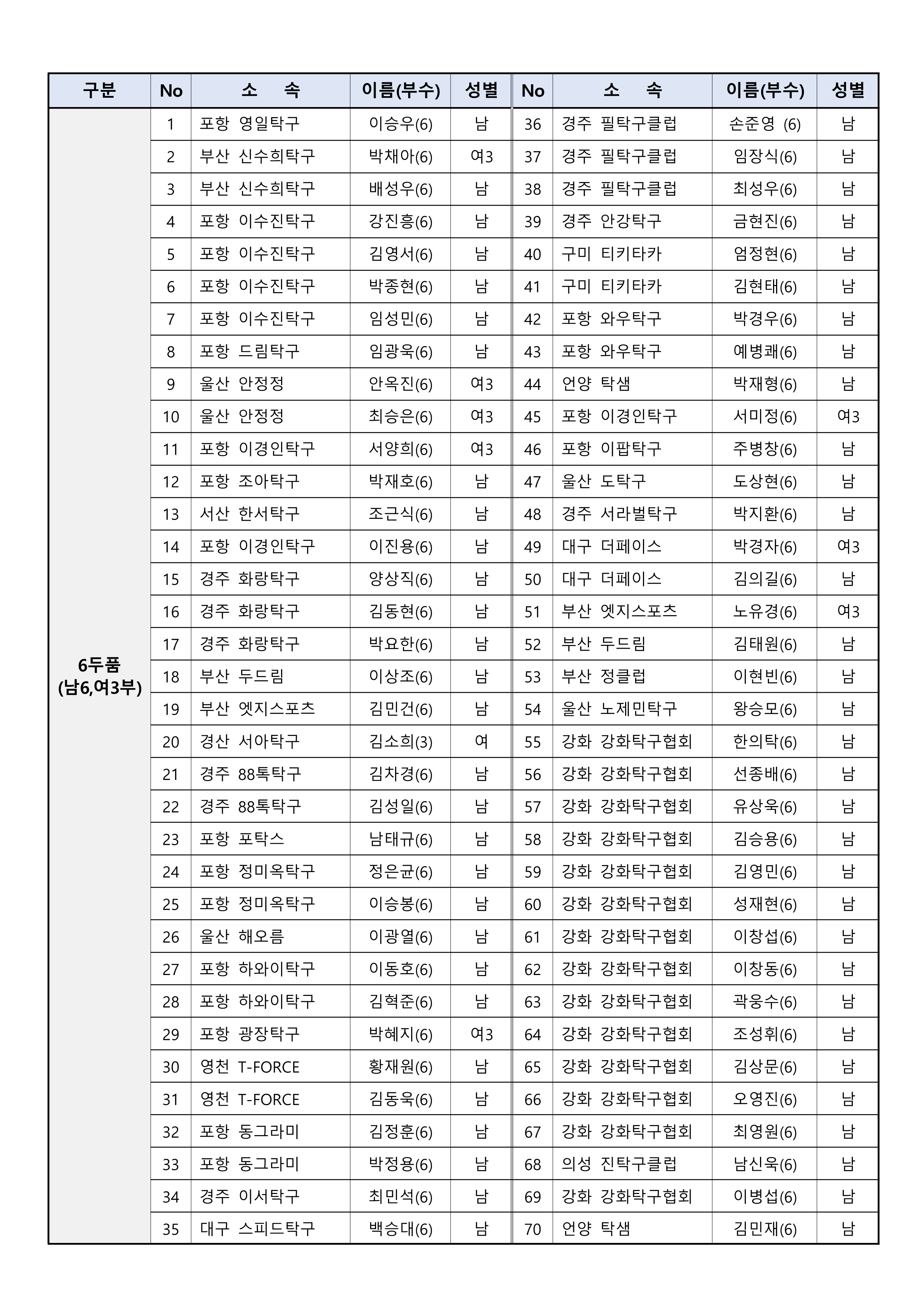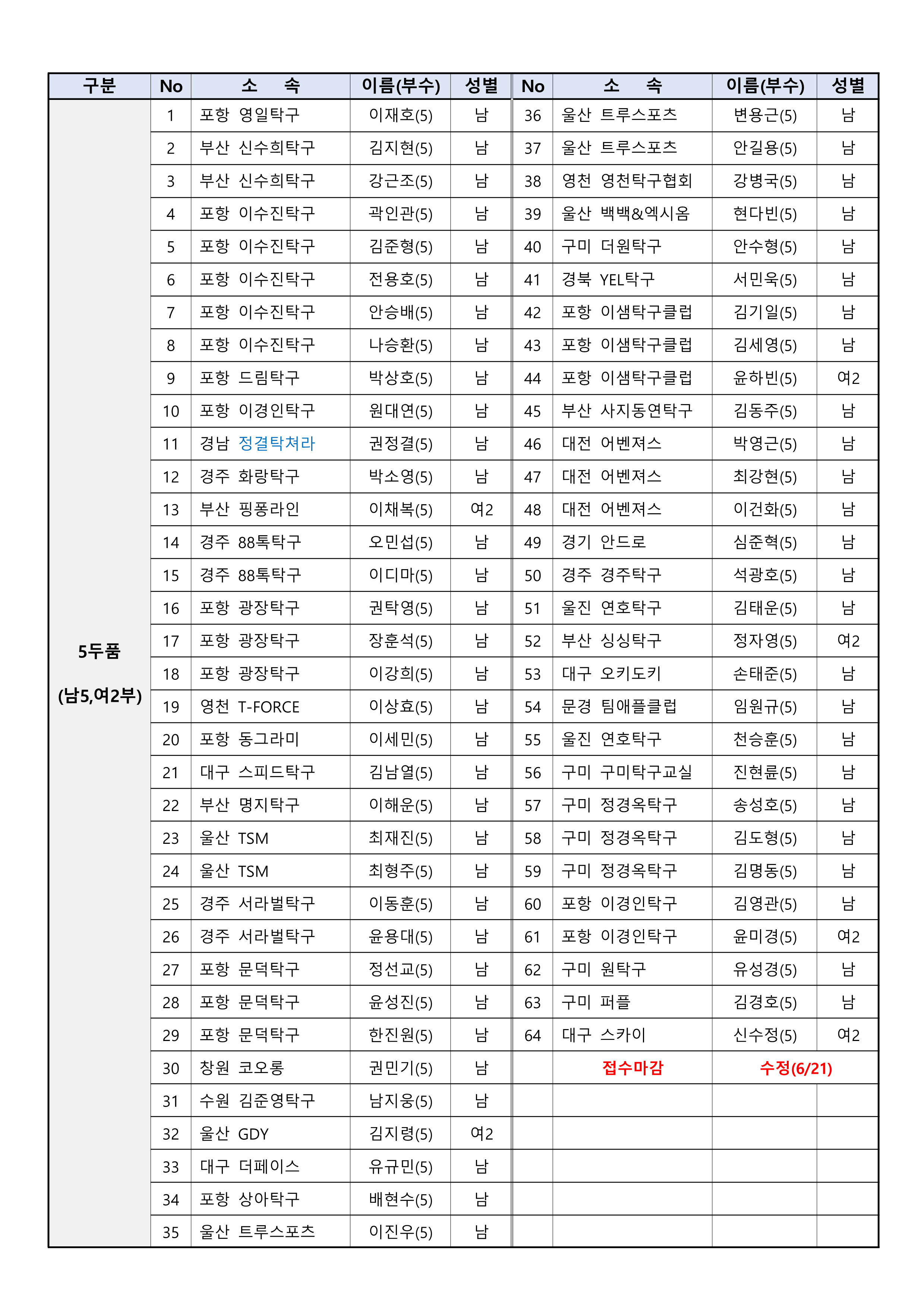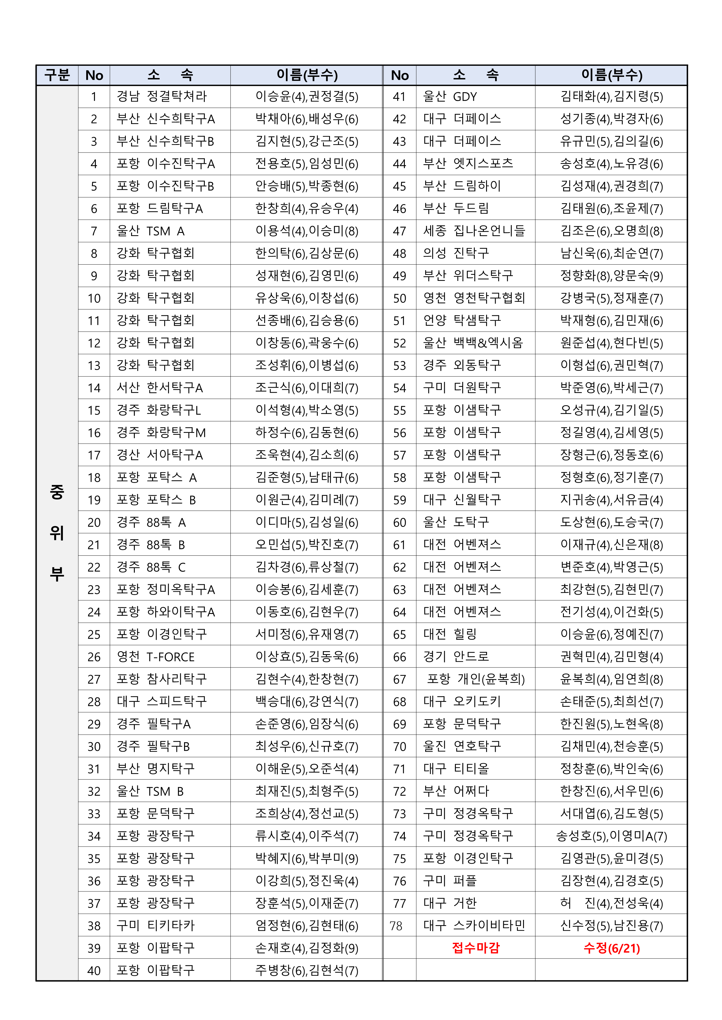 참가선수 명단을 아래와 같이 공지하오니 누락 되신분, 또는 소속, 이름, 부수 등 오류가 있는지 확인해 주시고,