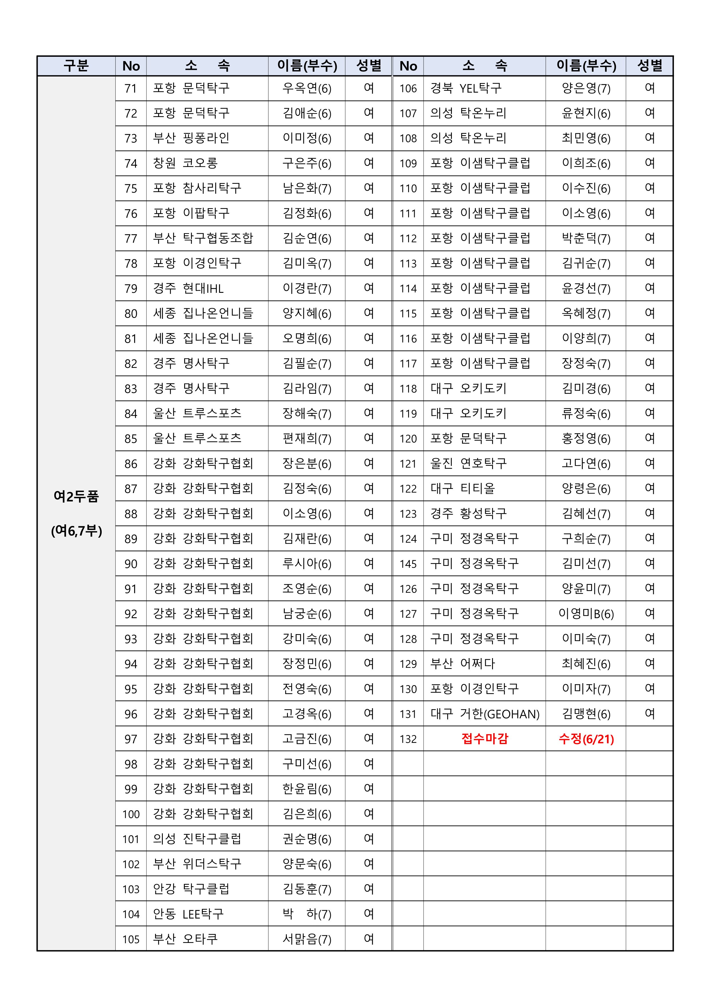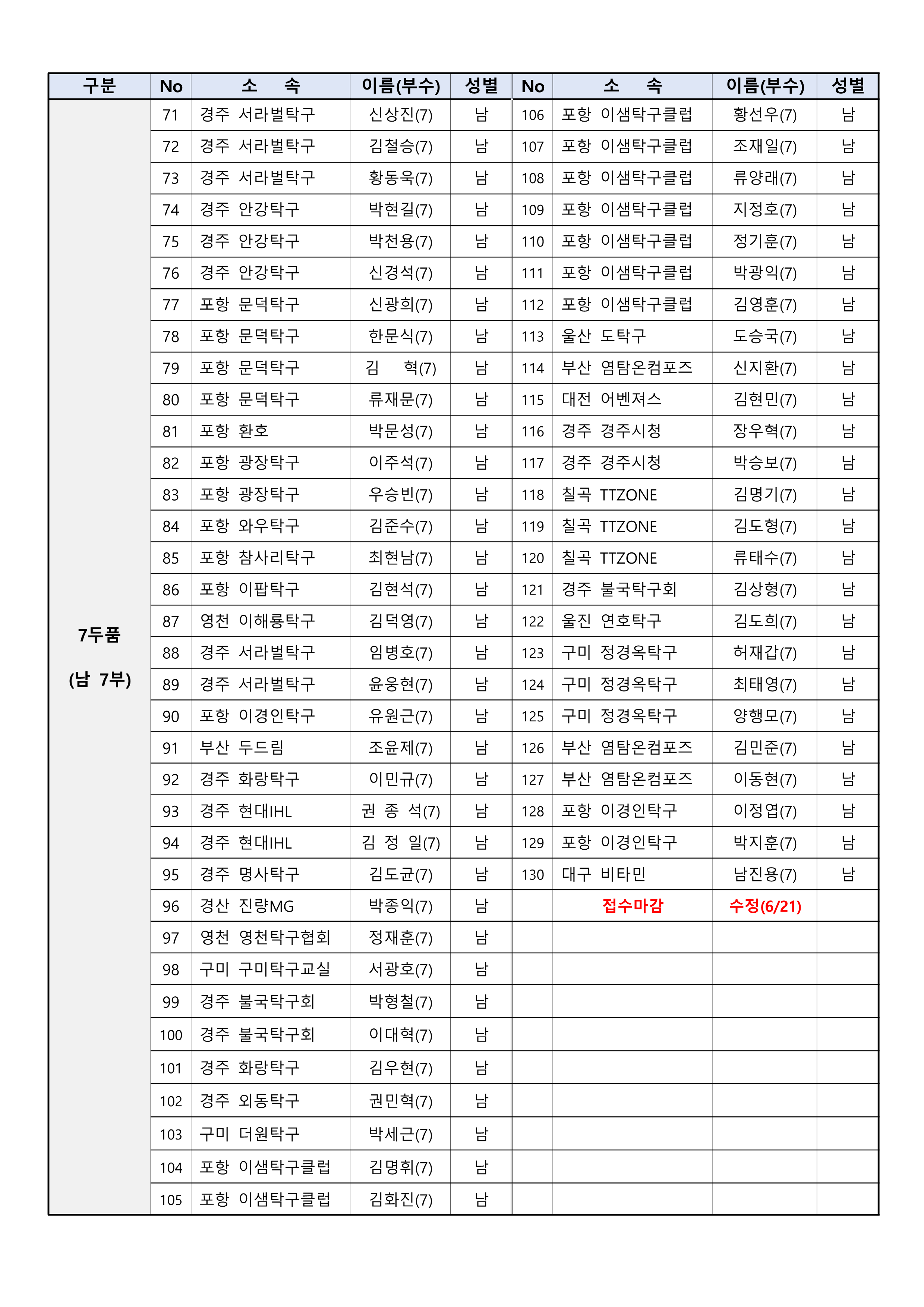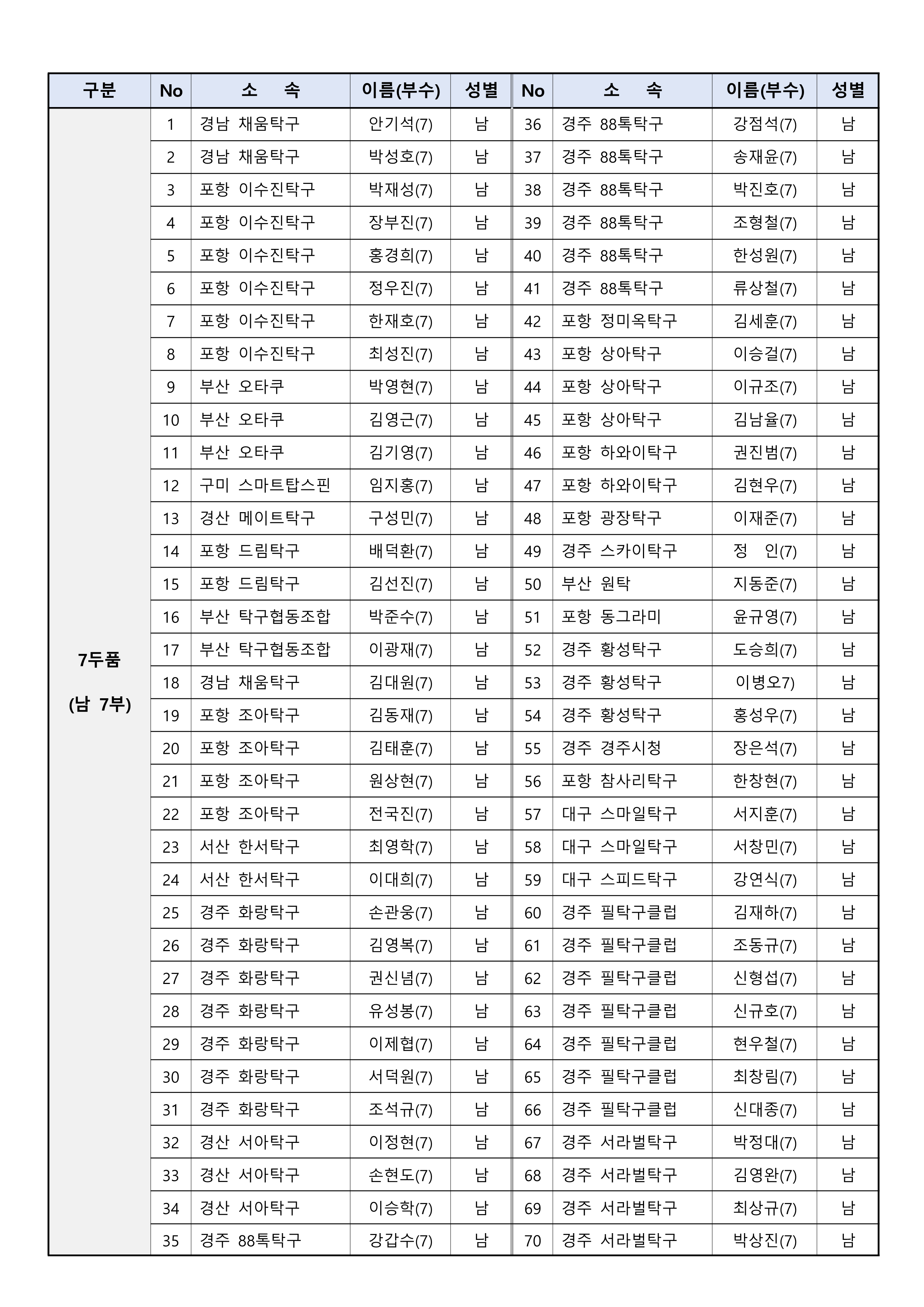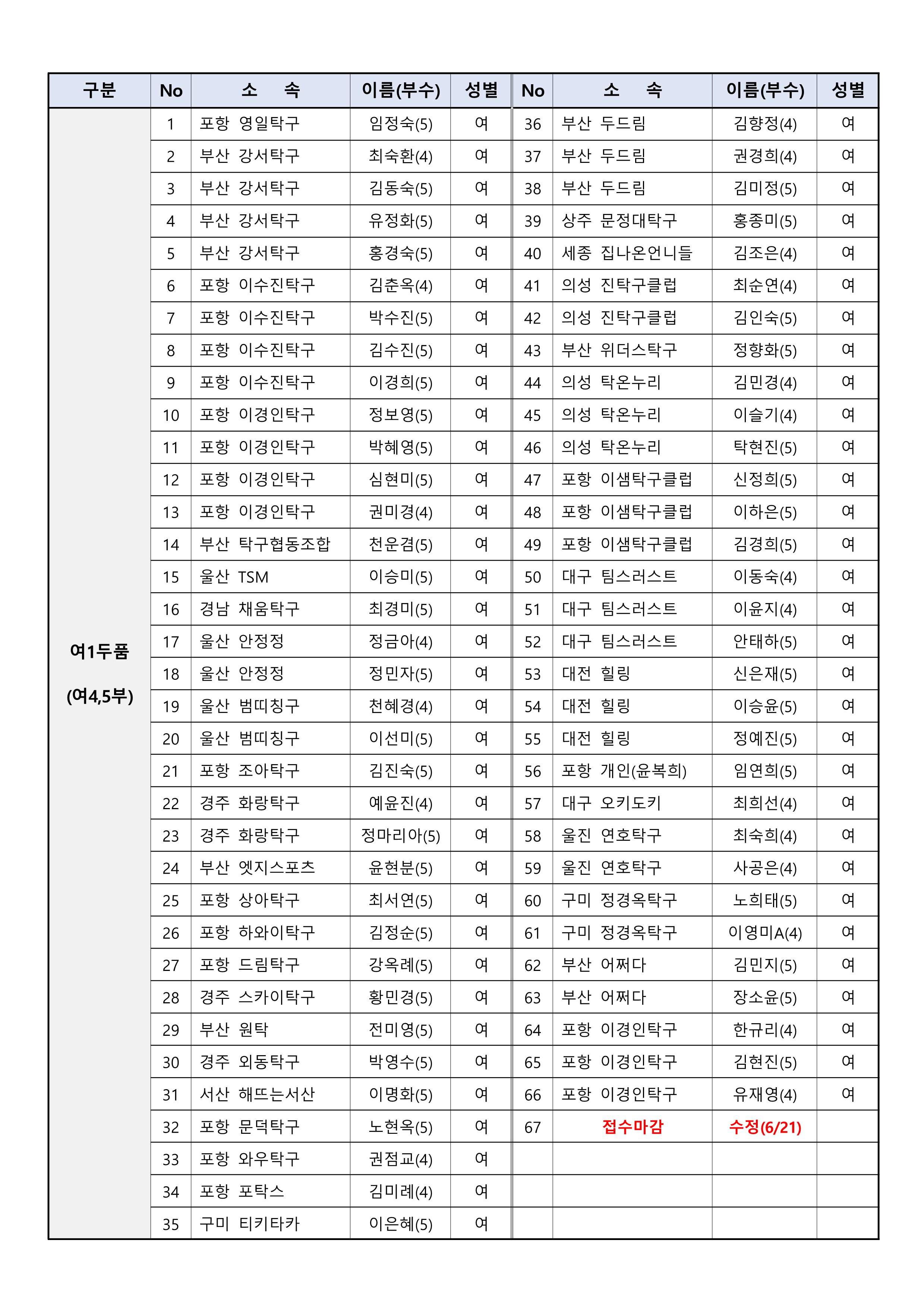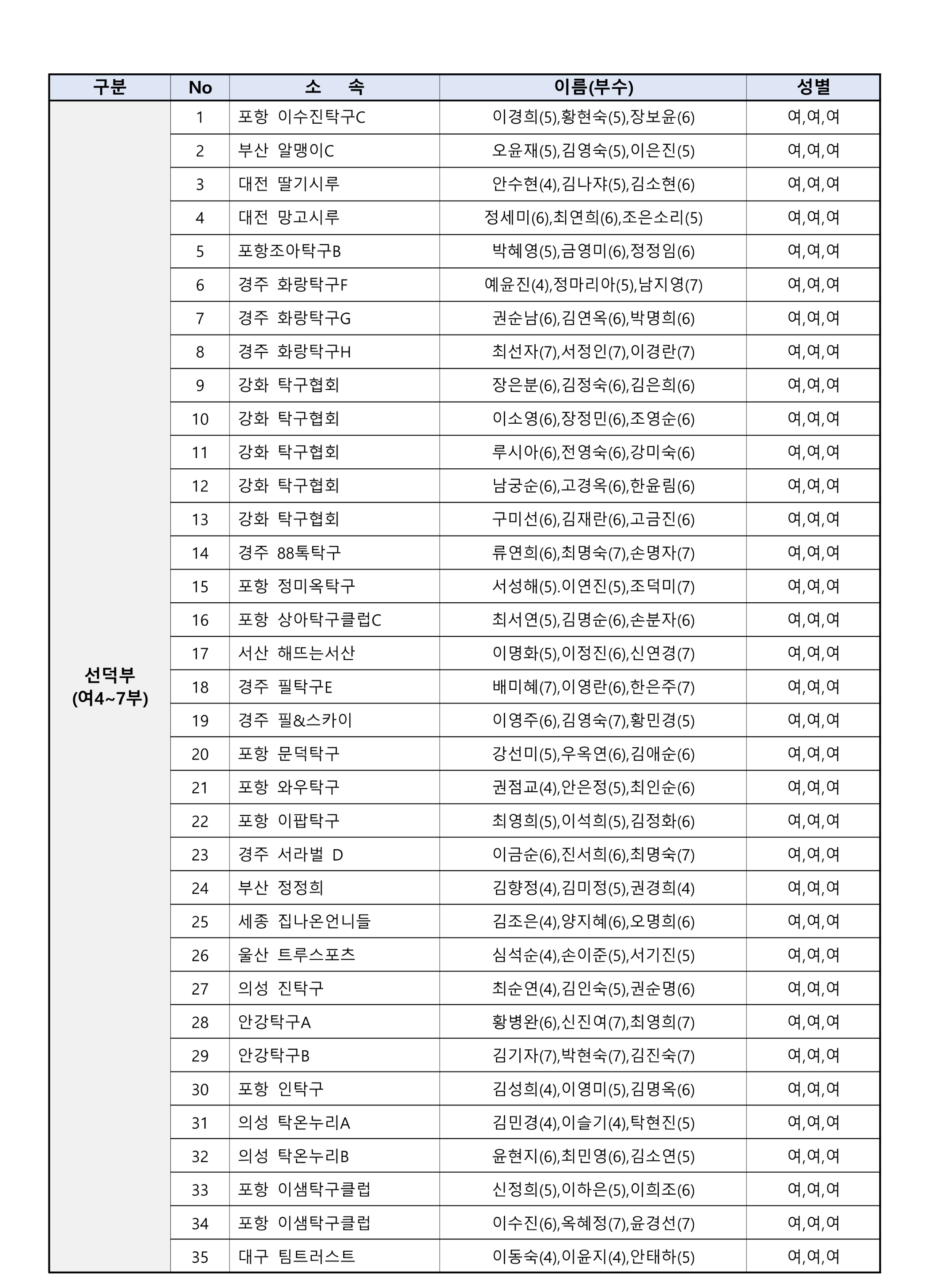 참가선수 명단을 아래와 같이 공지하오니 누락 되신분, 또는 소속, 이름, 부수 등 오류가 있는지 확인해 주시고,
