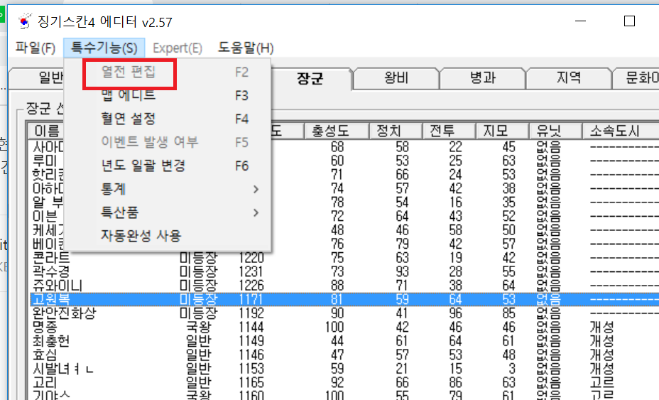 에디터 2.57 버전을 다운받아, 기존 징기스칸4 에서는 문제 없이 열전 탭이 활성화되서 수정이 가능했습니다만,