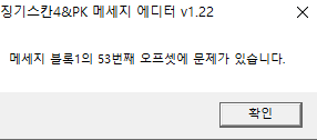 메세지 에디터 오프셋에 문제가 있다고 하네요 작성자이규보|작성시간22.03.22|조회수69 목록 댓글 2 글자크기 작게가 글자크기 크게가 이럴 경우 어느 부분을 수정하면 될까요? 다음검색 현재 게시글 추가 기능 열기 북마크 공유하기 신고 센터로 신고 댓글 댓글 2 댓글쓰기 답글쓰기 댓글 리스트 작성자이규보 작성자 본인 여부 작성자 | 작성시간 22.03.22 설명이 부족한 것 같아 덧붙이면 BLOCK01의 MSG052를 원본파일과 수정파일을 비교했음에도 차이가 없었습니다. 어디에 문제가 있는지 알 수 있을까요? 답댓글 작성자김통정 | 작성시간 22.03.22 BLOCK1-MSG051로 이동한 후에 오프셋 수정 클릭하고 8257을 입력하세요.무슨 이유인지는 모르겠지만 그 항목의 오프셋에 이상한 값이 들어가 있었던 게 원인인 듯 싶습니다. 댓글 전체보기