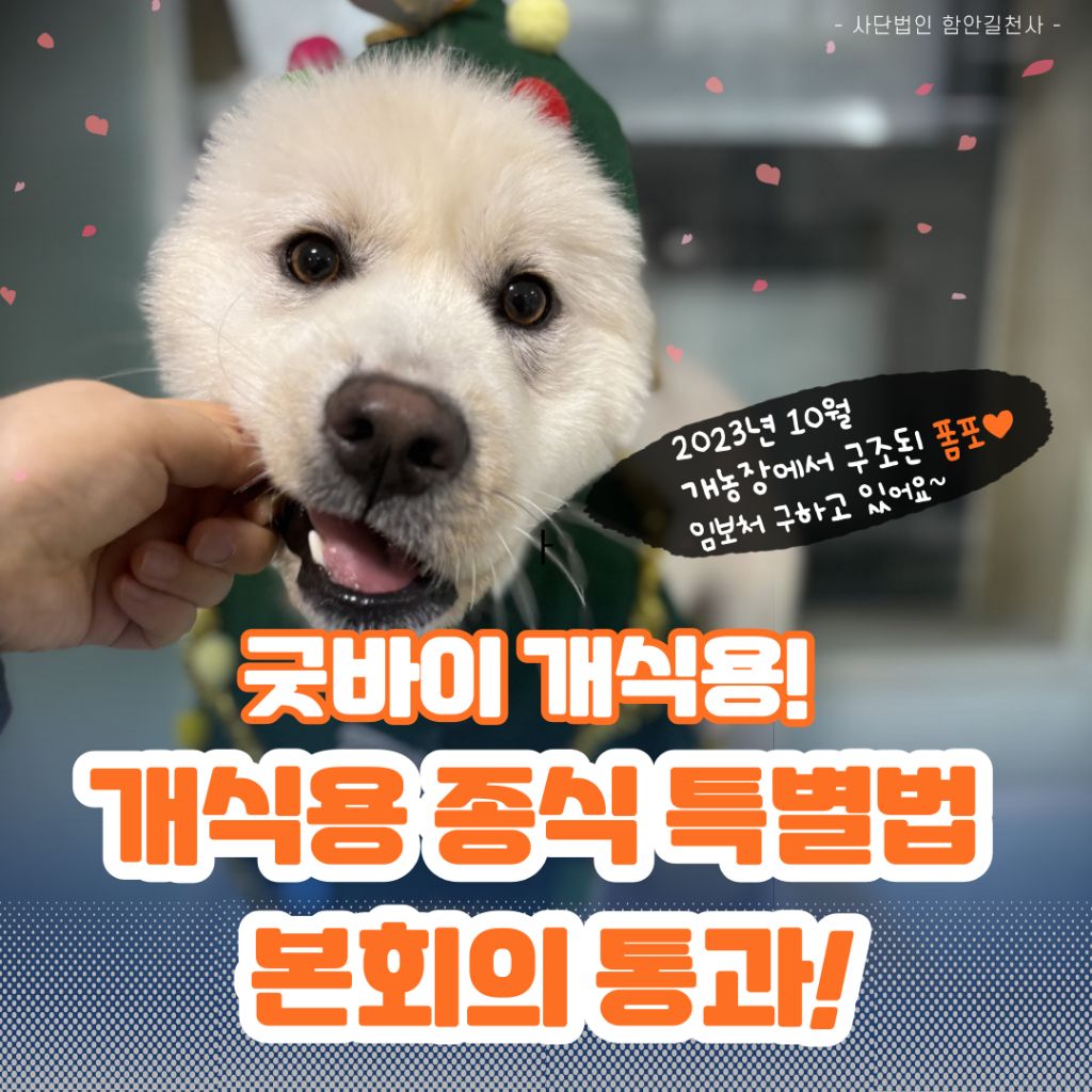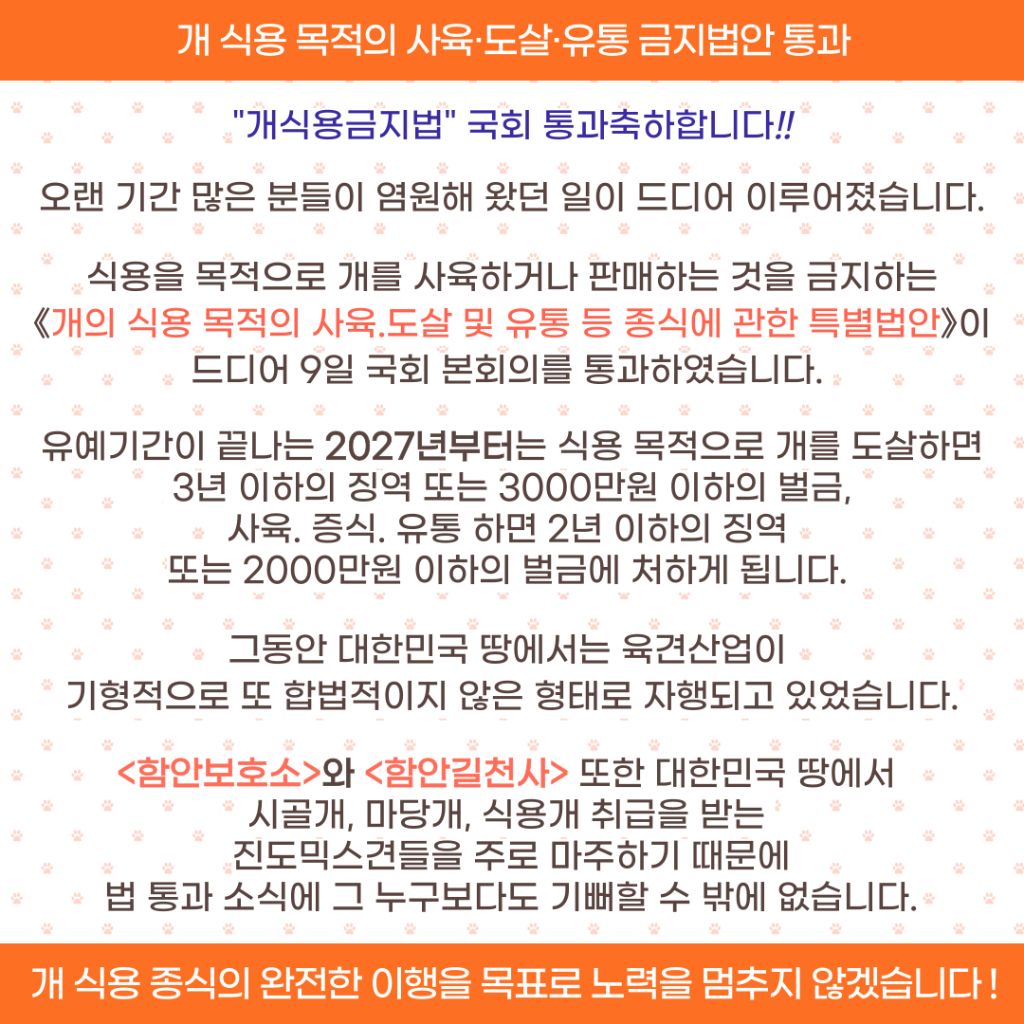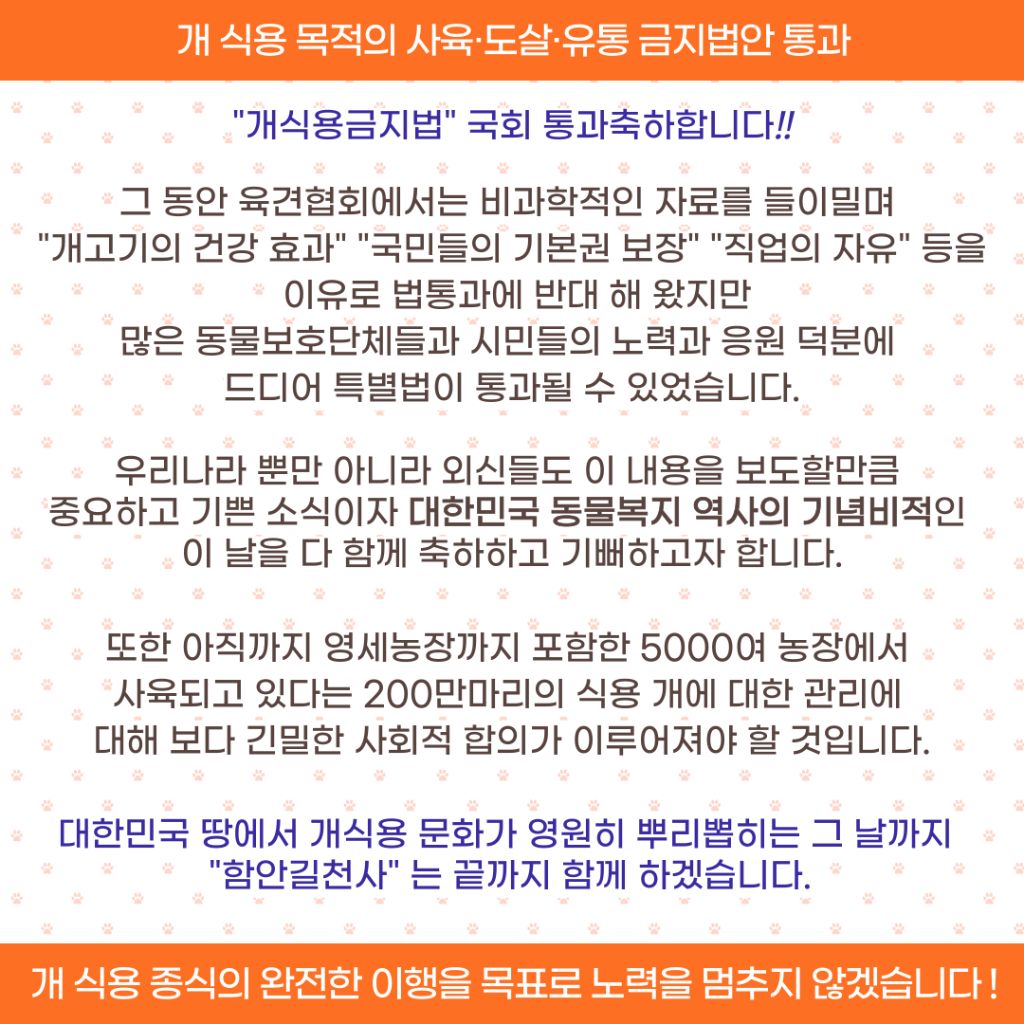 [공지사항]개식용금지법 국회 통과를 축하합니다 작성자최하나(마루네)|작성시간24.01.10|조회수60 목록 댓글 0 글자크기 작게가 글자크기 크게가 다음검색 현재 게시글 추가 기능 열기 북마크 공유하기 신고 센터로 신고 댓글 댓글 0 댓글쓰기 답글쓰기 댓글 리스트