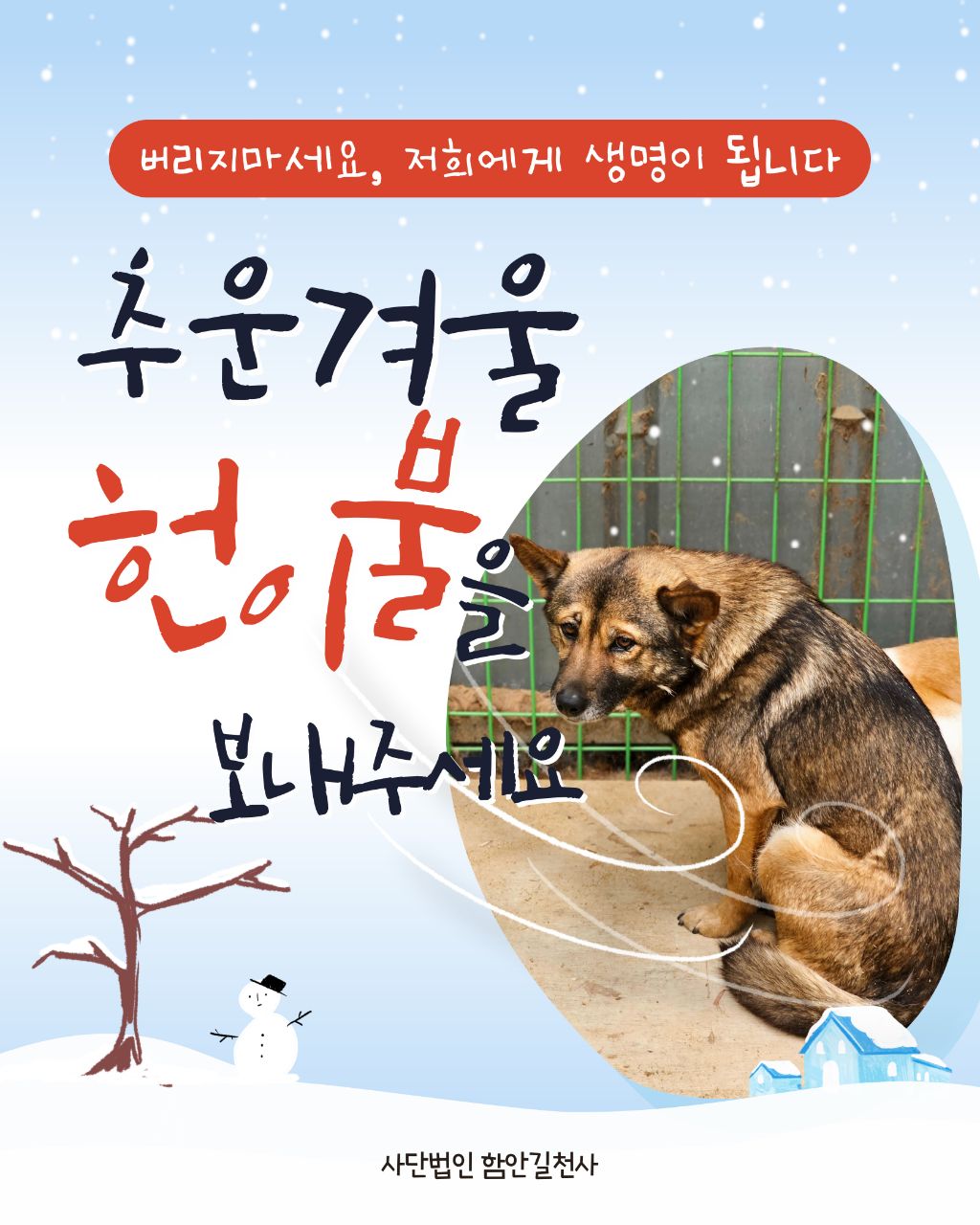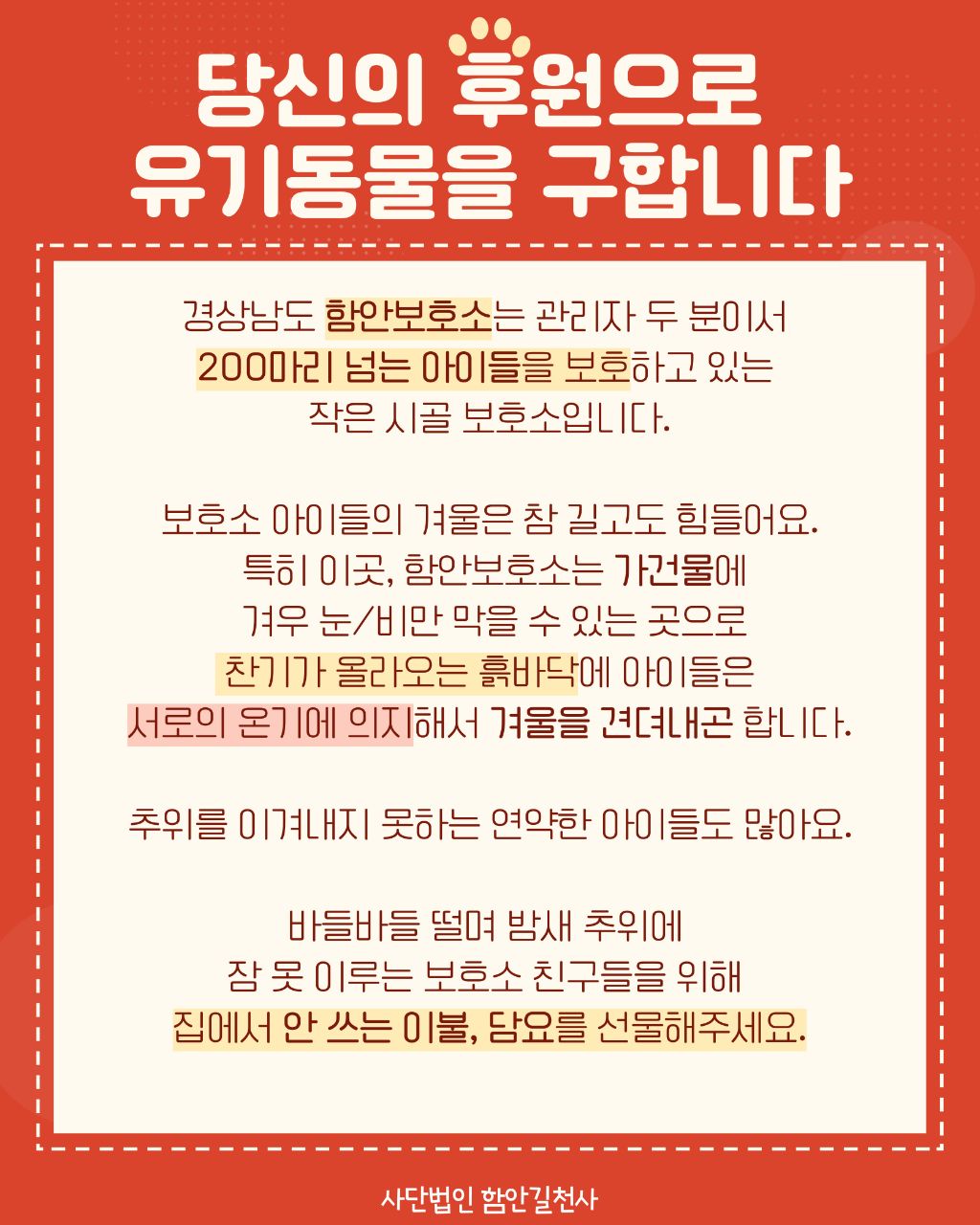 경상남도 시골에 위치한 함안보호소에도 겨울이 찾아왔습니다. 보호소 아이들의 겨울은 참 길고도 힘들어요. 특히 이곳 함안보호소는 견사부족으로 증축한 가건물에 겨우 눈/비만 막을 수 있는 곳으로 찬기가 올라오는 흙바닥에 아이들은 서로의 온기에 의지해서 겨울을 견뎌내곤 합니다.