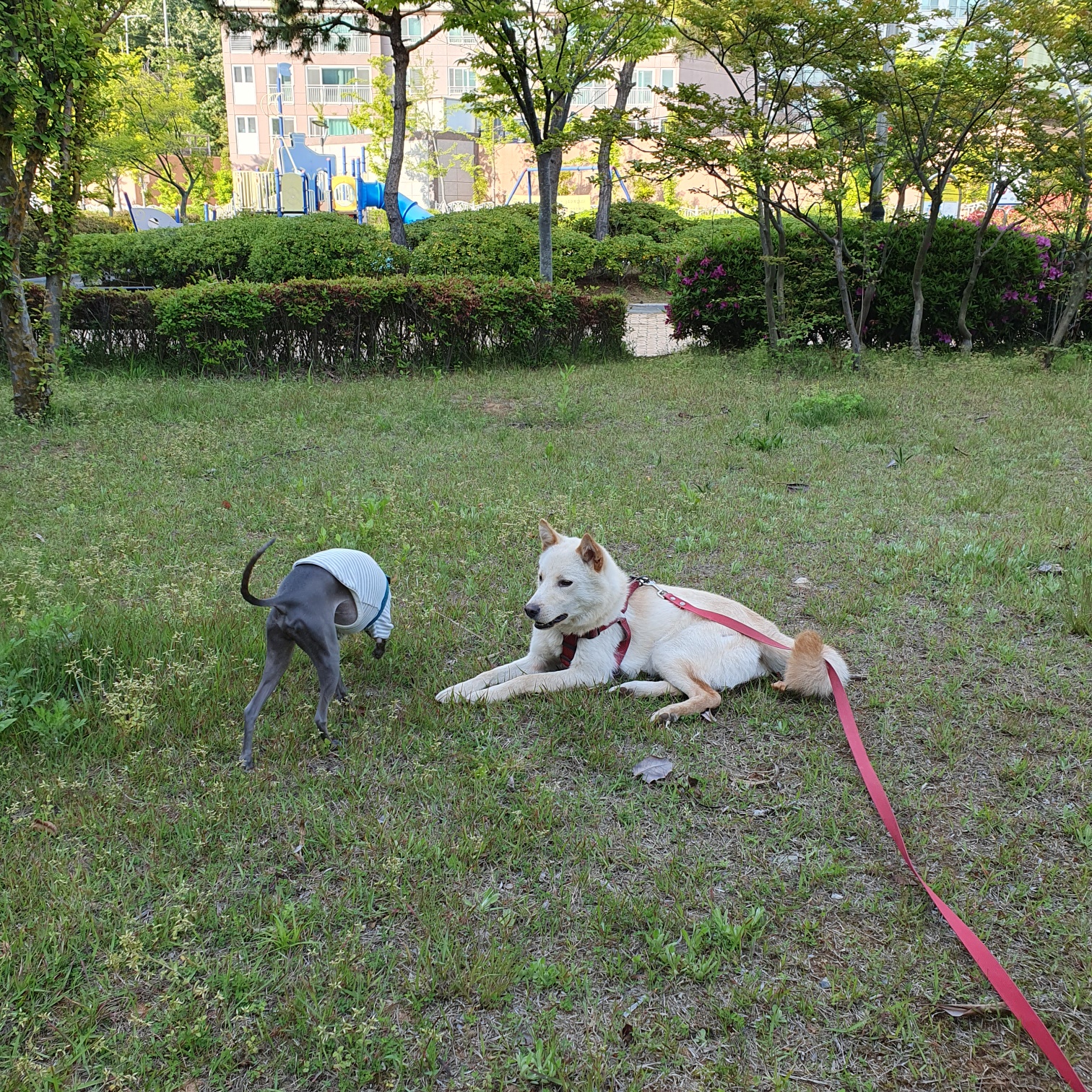 -처음 크림이가 혼자 산책 다닐때는 승강기, 계단, 지하주차장, 복도 등등 실내 모든 곳에서 두려움이 가득찼고 움직이지 않으려고해서 안고 다녔어요. 야외에서도 사람을 피하고 차소리도 무서워하고...근데, 저희집 반려견과 함께 산책을 나간 후로는 놀라운 속도로 모든 공간에 빠르게 적응을 했습니다.