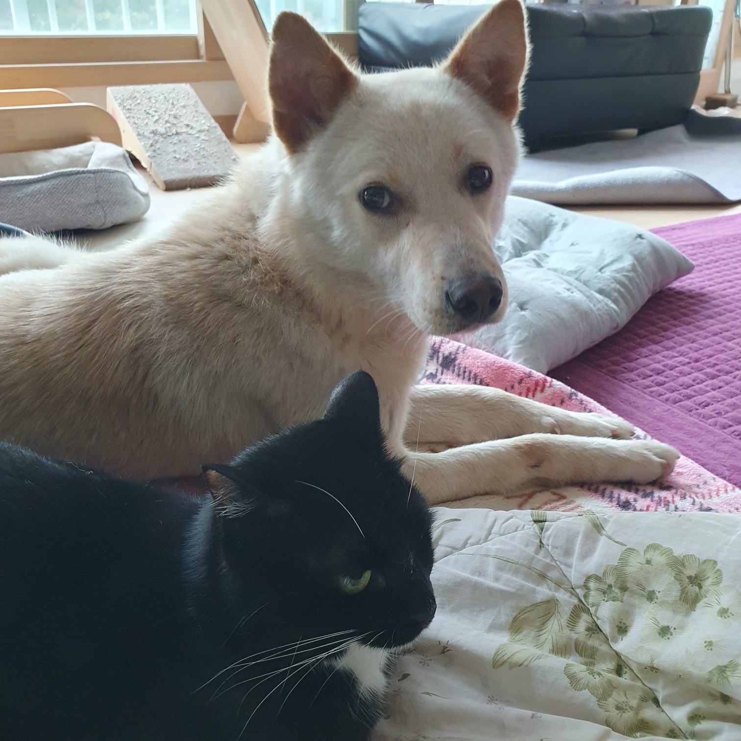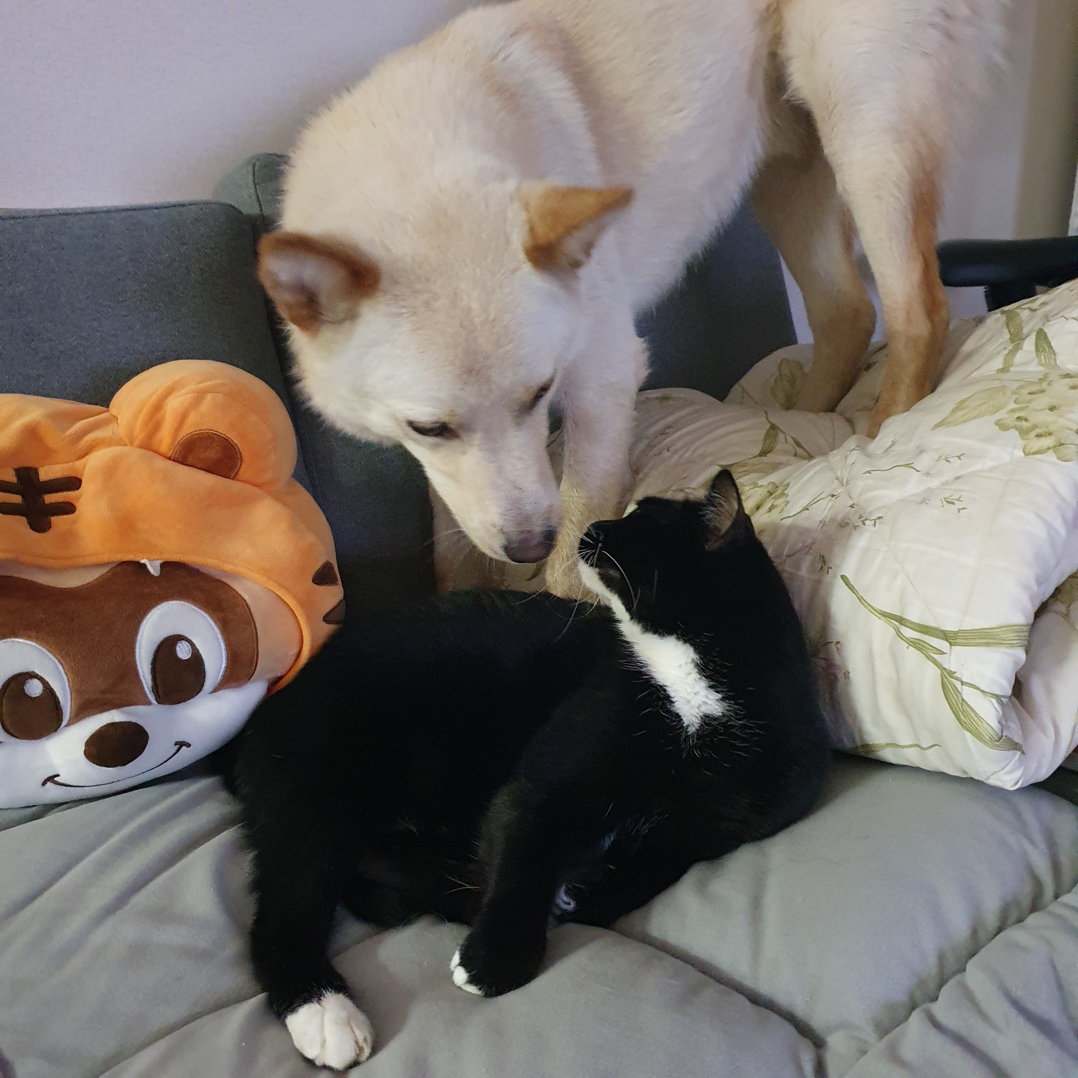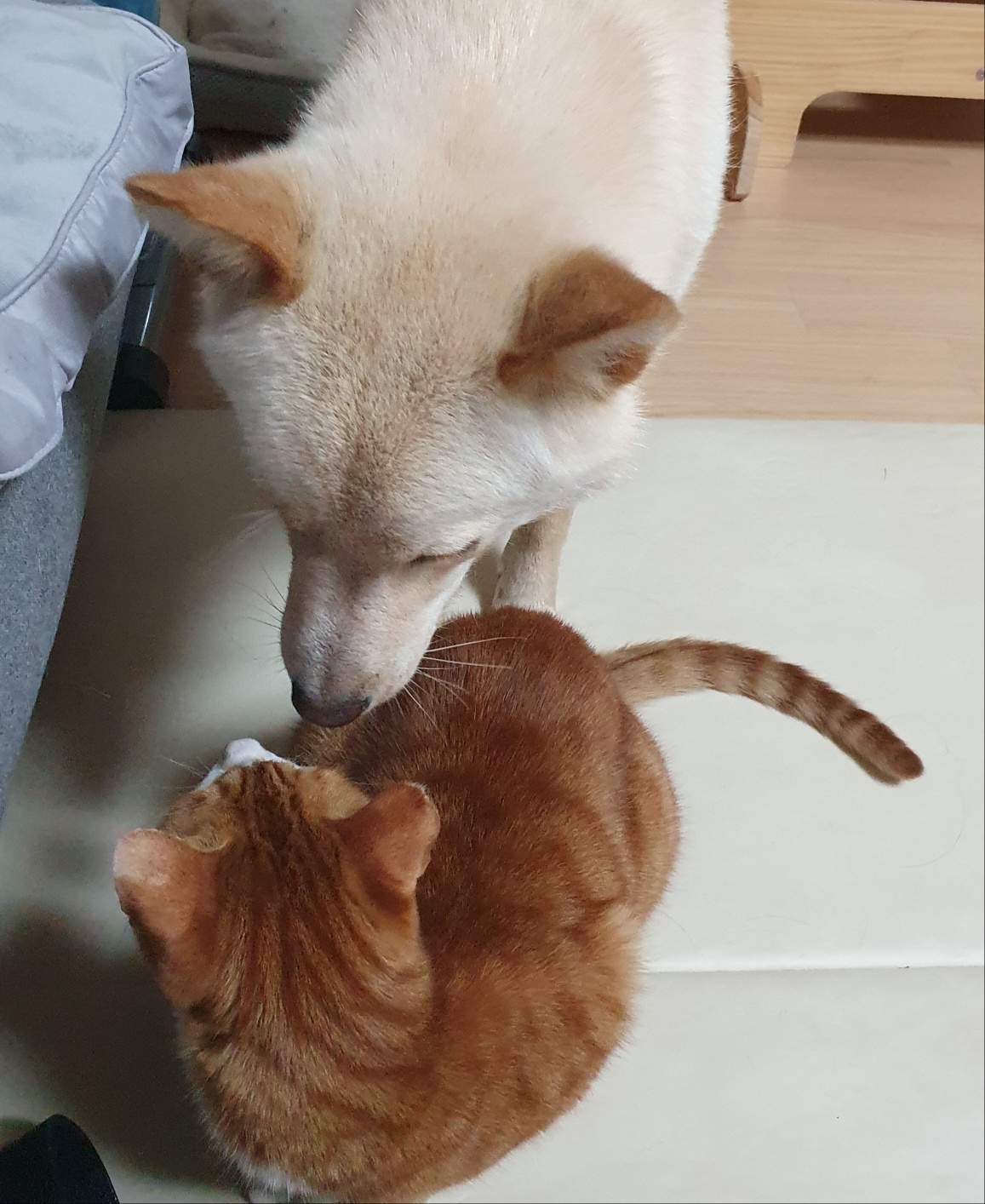 -함께 지내는 반려동물들과 각자 영역을 침범하지 않으며 평화롭게 잘 지냅니다. 작은 소형견에게도 공격적인 표현을 하지 않습니다👍