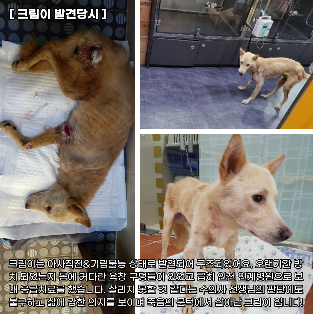 크림이는 2021년 발견 당시 아사 직전&기립불능한 자세로 풀밭에 있었고 신고로 보호소에 입소하였어요.