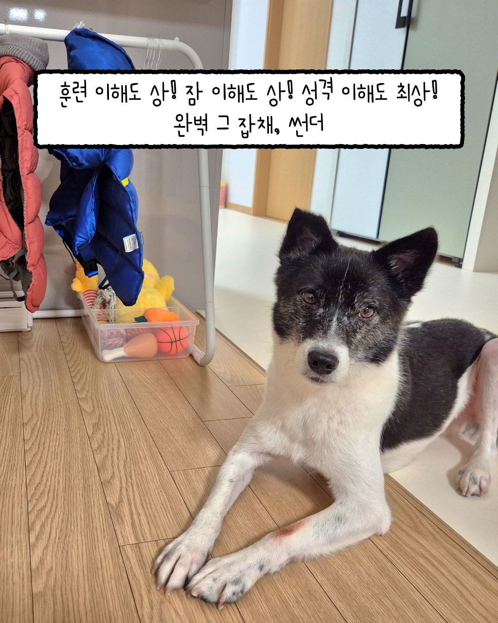 집에서의 썬더는 거의 ‘고요함 그 자체’. 혼자서도 잘 쉬고, 조용히 침대나 쿠션에 누워 꿈나라 여행을 떠나요. 강아지를 처음 키우시는 초보 반려인에게 부담 없는 편안한 에너지를 가지고 있어요.