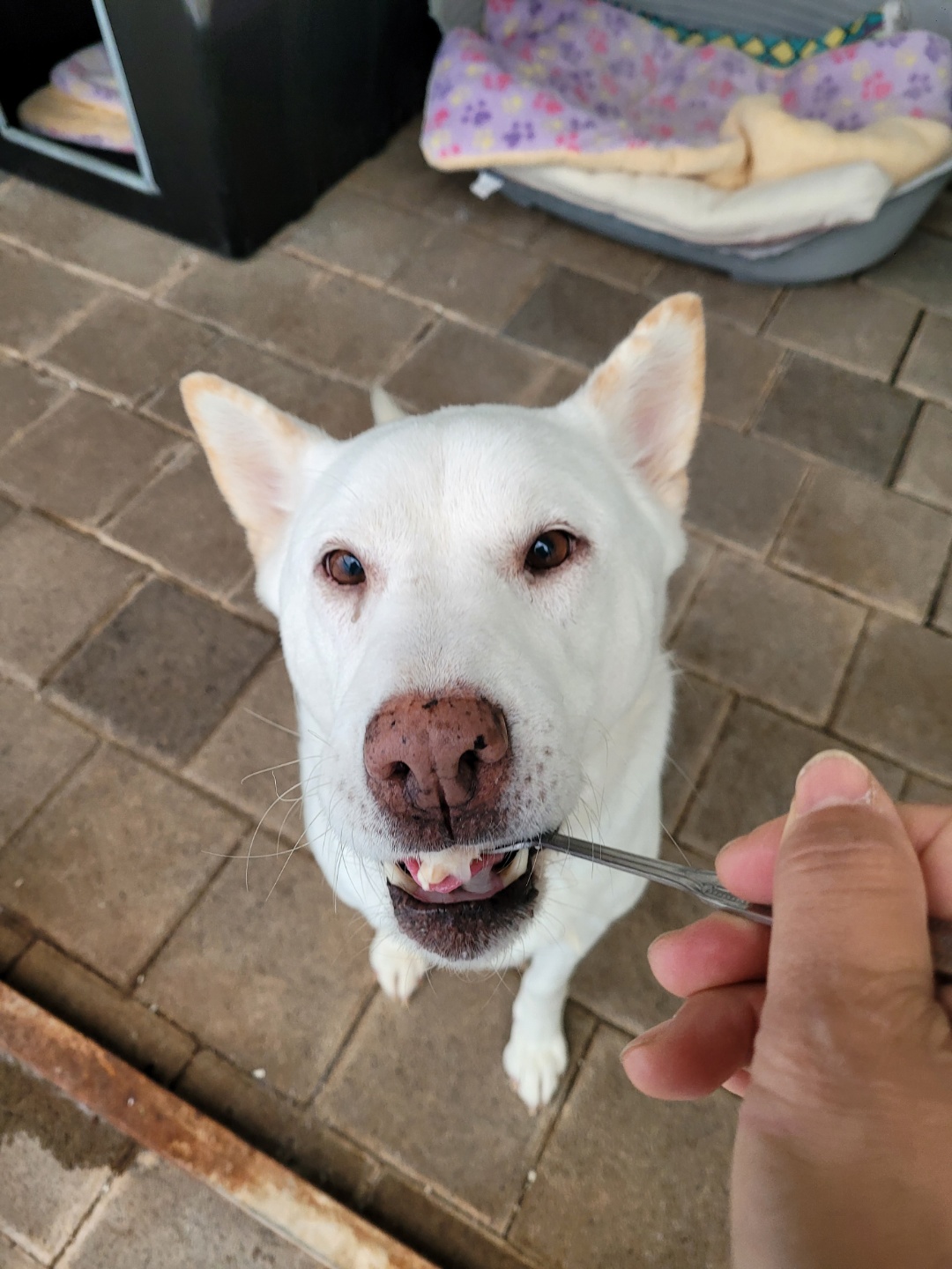 👉현재 실외 견사에서 지내기 때문에 견사 밖에 나가 하루 두 번 배변함, 진도믹스견 대부분이 그렇듯 하루 최소 두 번 실외 배변 산책 필요