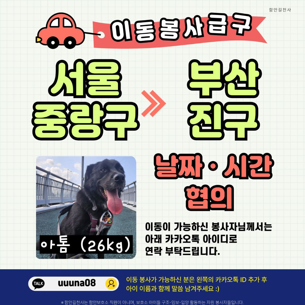 이동 봉사 가능하신 분께서는 아래 카카오톡으로 연락 부탁드려요. 감사합니다♡