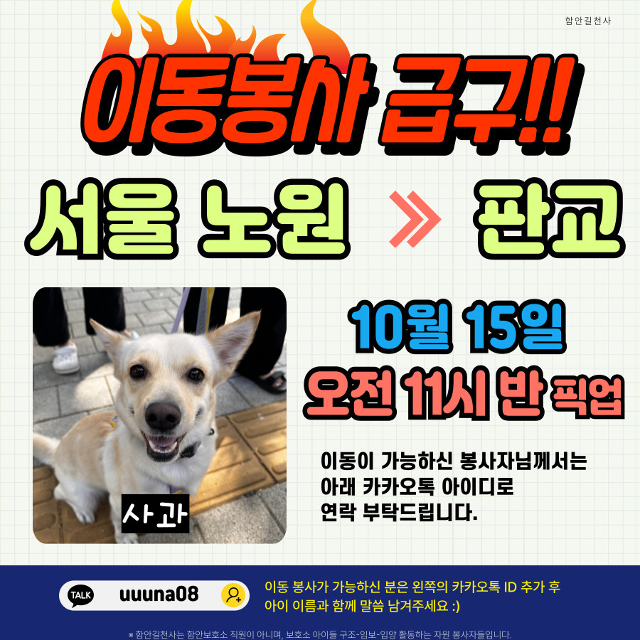 이동 봉사 가능하신 분께서는 아래 카카오톡으로 연락 부탁드려요. 감사합니다♡