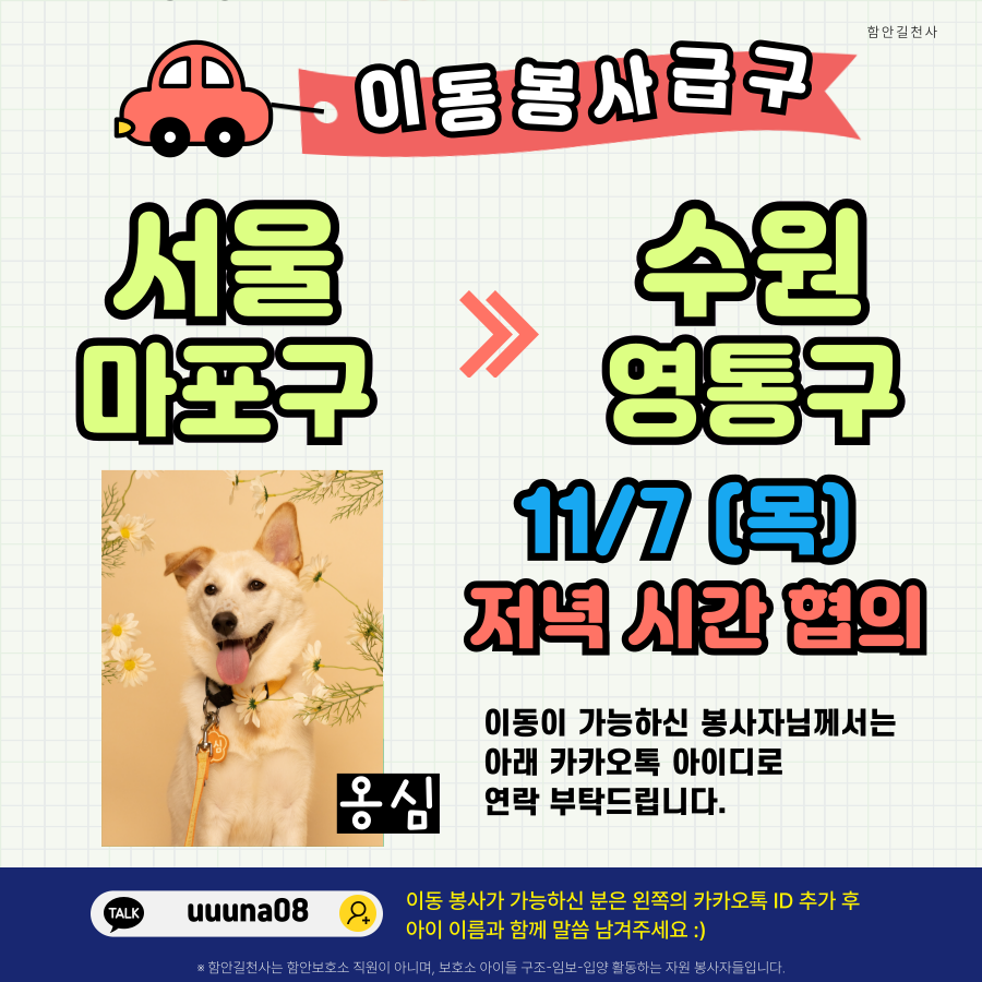 급!! 옹심이의 이동을 도와주실 봉사자님을 구해요.
