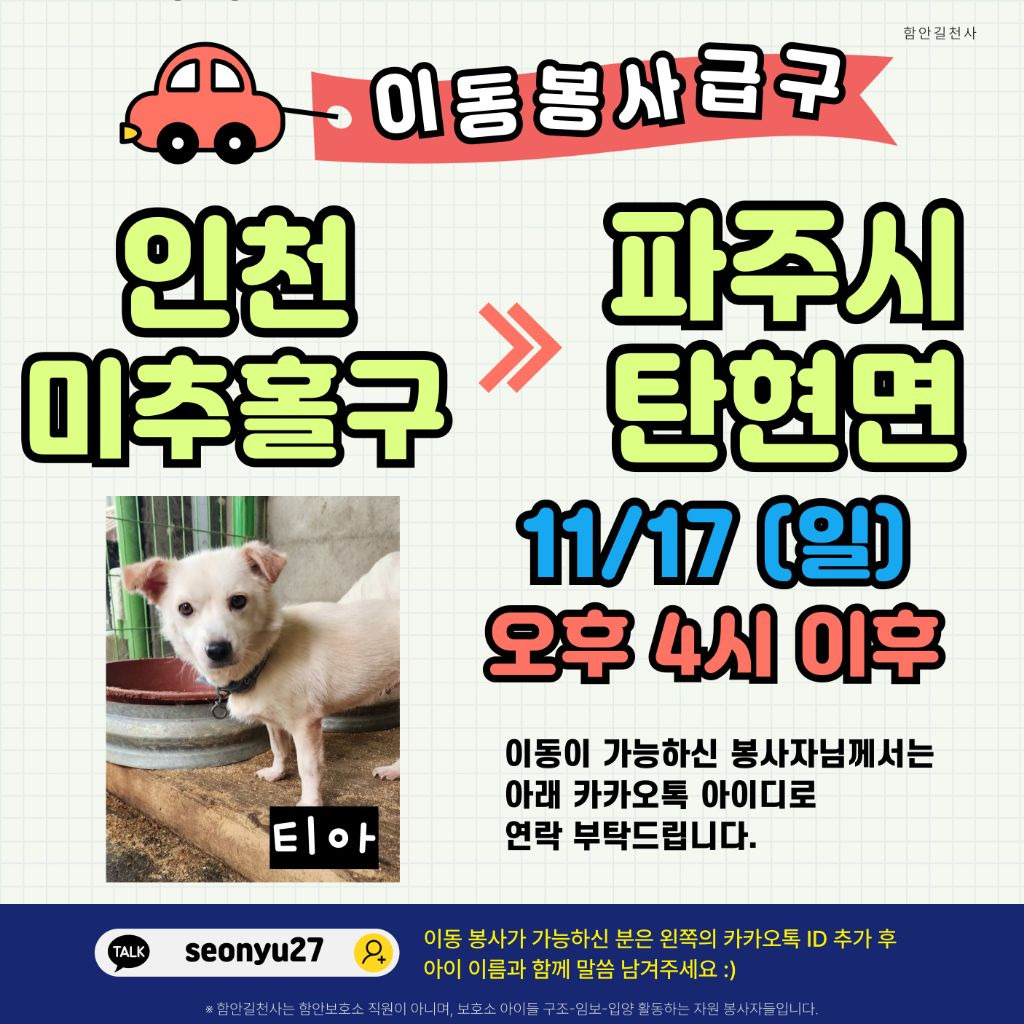 🚙급!! 지나와 티아의 이동을 도와주실 봉사자님을 구해요.