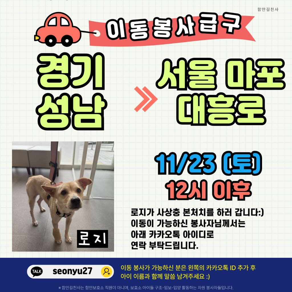 이동 봉사 가능하신 분께서는 아래 카카오톡으로 연락 부탁드려요. 감사합니다♡