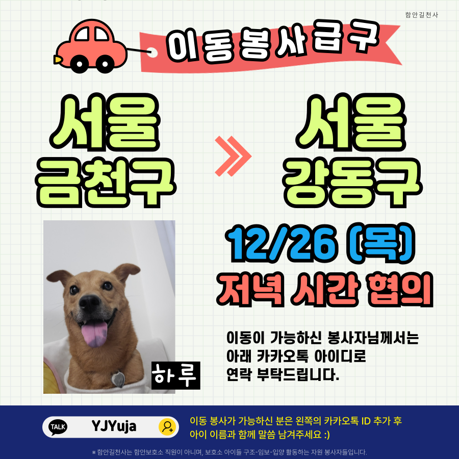 이동 봉사 가능하신 분께서는 아래 카카오톡으로 연락 부탁드려요. 감사합니다♡