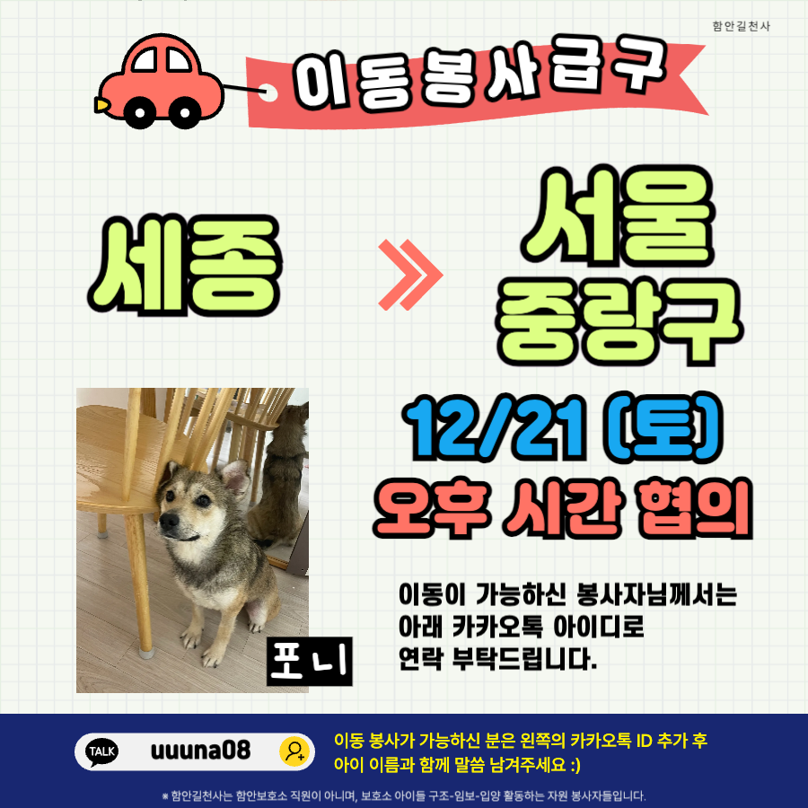 급!! 포니의 이동을 도와주실 봉사자님을 구해요.