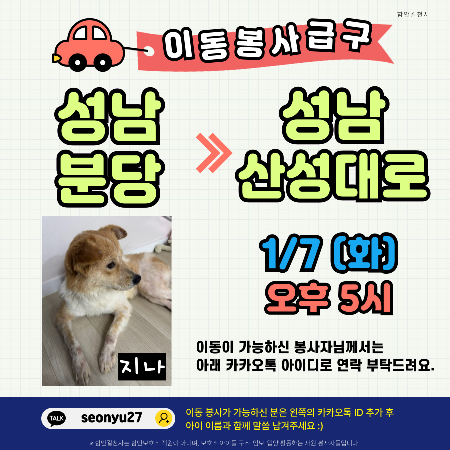 🚙급!! 지나의 이동을 도와주실 봉사자님을 구해요.