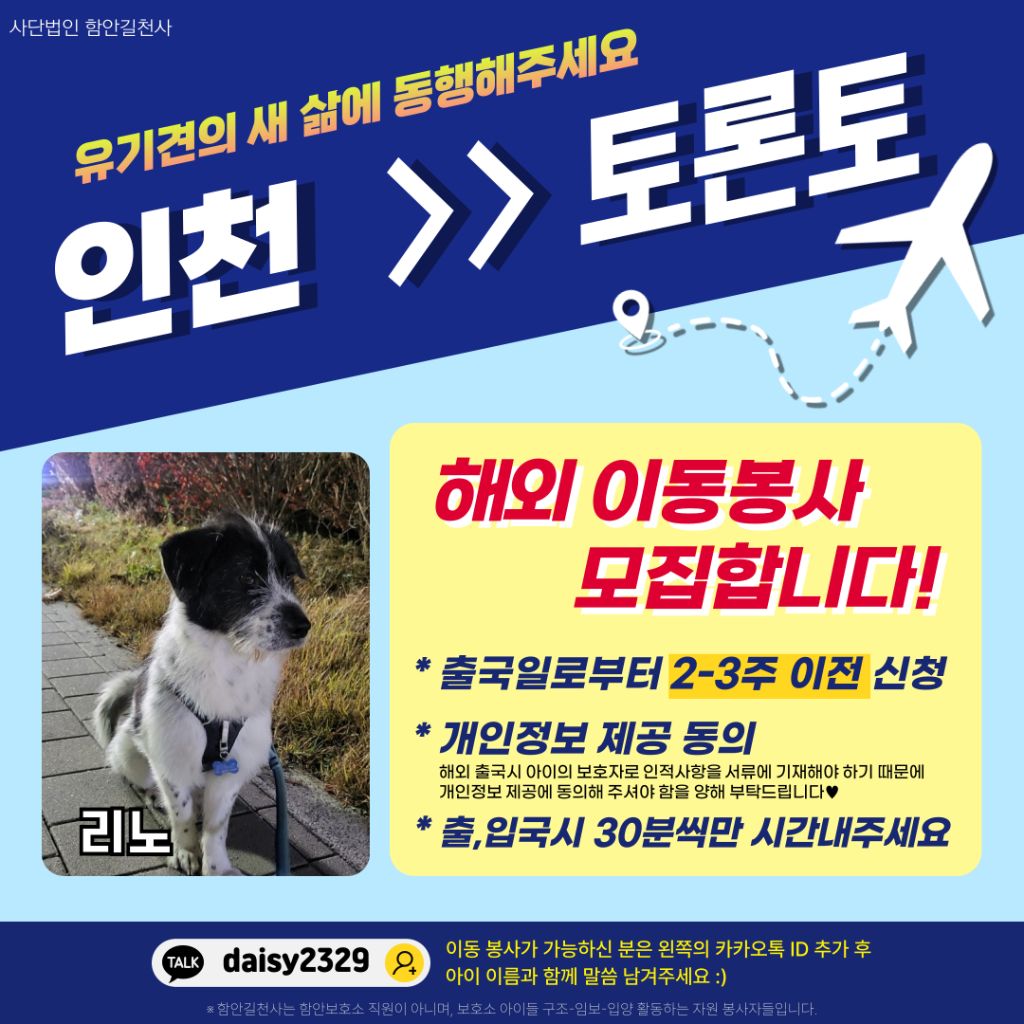 리노가 하루 빨리 평생가족 만나 행복한 제2의 견생을 시작 할 수 있도록 토론토로 갈 예정이 있으신 분이 계시다면 해외 이동봉사 신청 부탁드립니다!