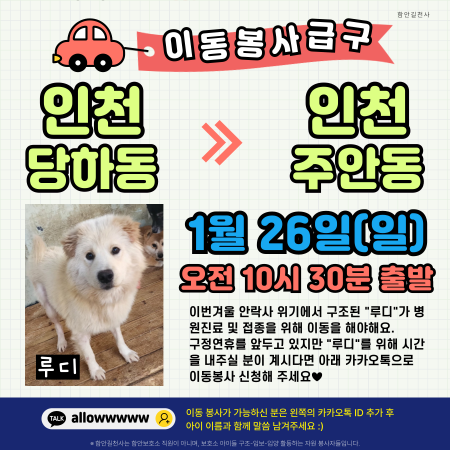 구정연휴를 앞두고 있지만 "루디"를 위해 시간을 내주실 분이 계시다면 아래 카카오톡으로 이동봉사 신청해 주세요💕