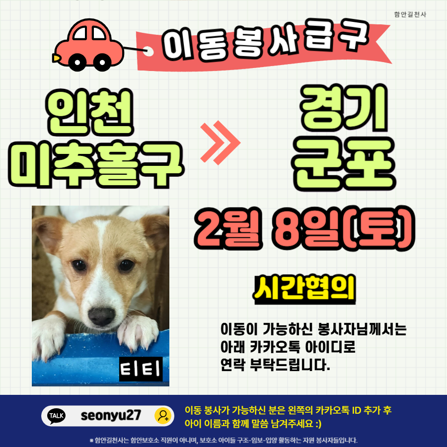 추운 날씨지만 "티티"를 위해 따뜻한 마음을 베풀어 주실 수 있으실까요? 이동봉사 가능하신 분이 계시다면 아래 카카오톡으로 이동봉사 신청해 주세요💕