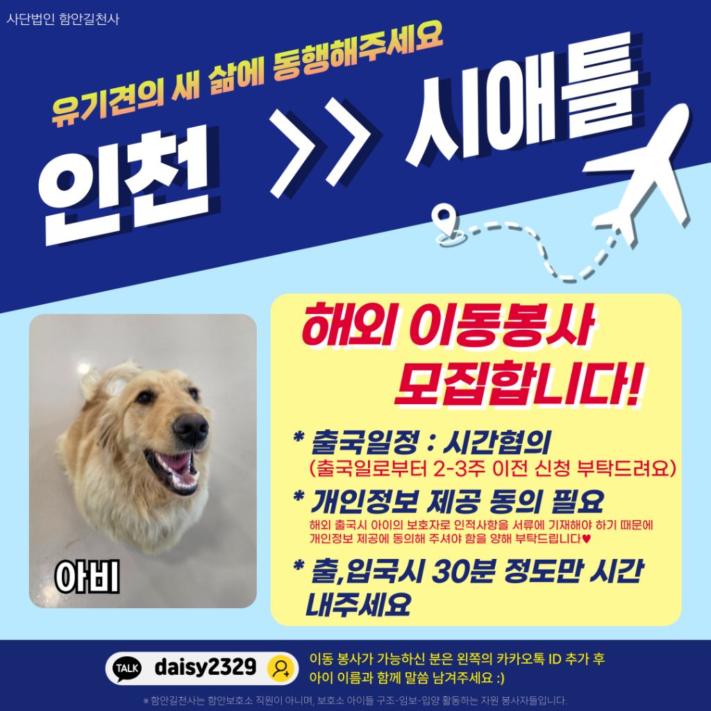 아비가 하루 빨리 평생가족 만나 행복한 제2의 견생을 시작 할 수 있도록 시애틀로 갈 예정이 있으신 분이 계시다면 해외 이동봉사 신청 부탁드립니다!
