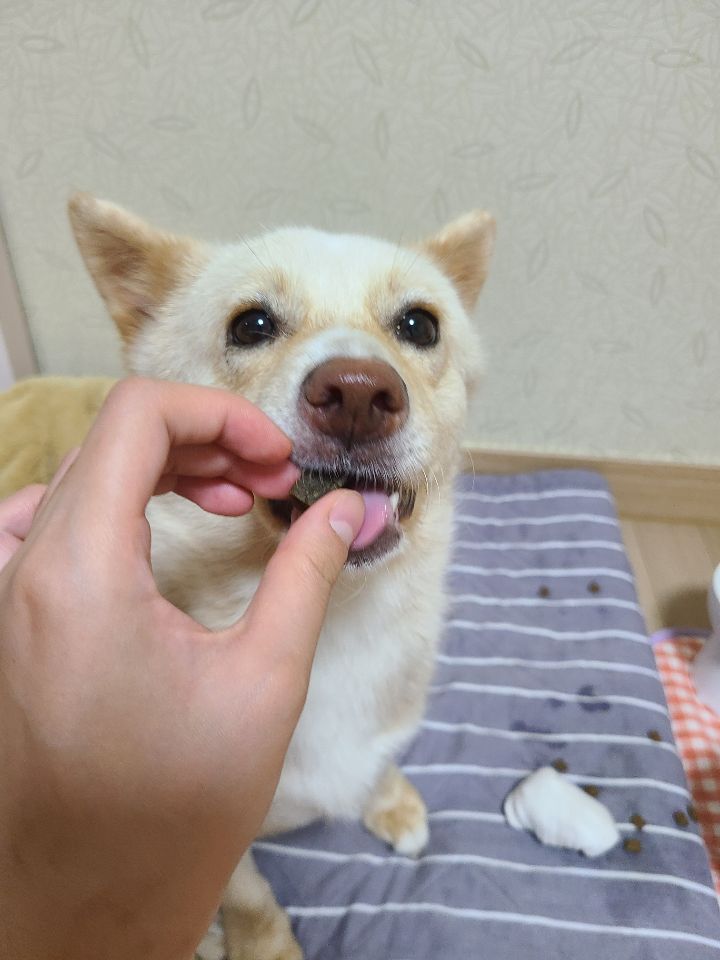 이렇게 숨겼었는데 요즘 자꾸 만졌더니 거부감이 덜해져서 만져줄때 손도 주고 개인기 시킬때도 가끔 줘요