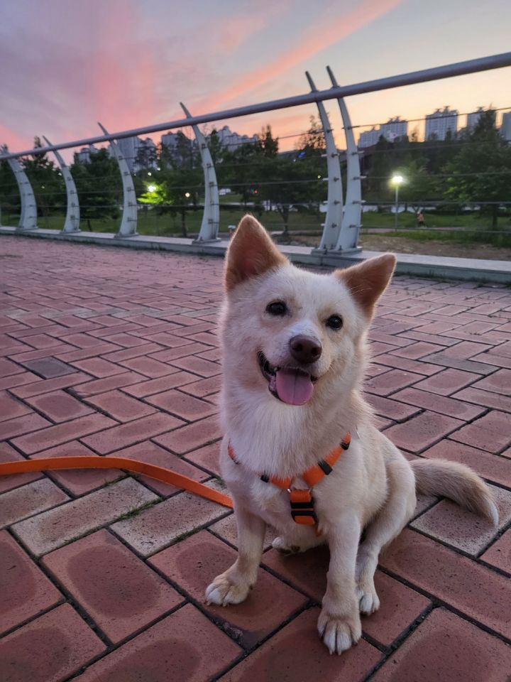 크게 달라진점이 딱 침대 한쪽편에만 있다가 눈치보며 밥먹고 도망가기만 했는데 한달 전부터 옷을 입거나 어디를 가려고 하면 따라나오기 시작하더니 이제는 자기가 산책 나오고 싶을때마다 나오네요