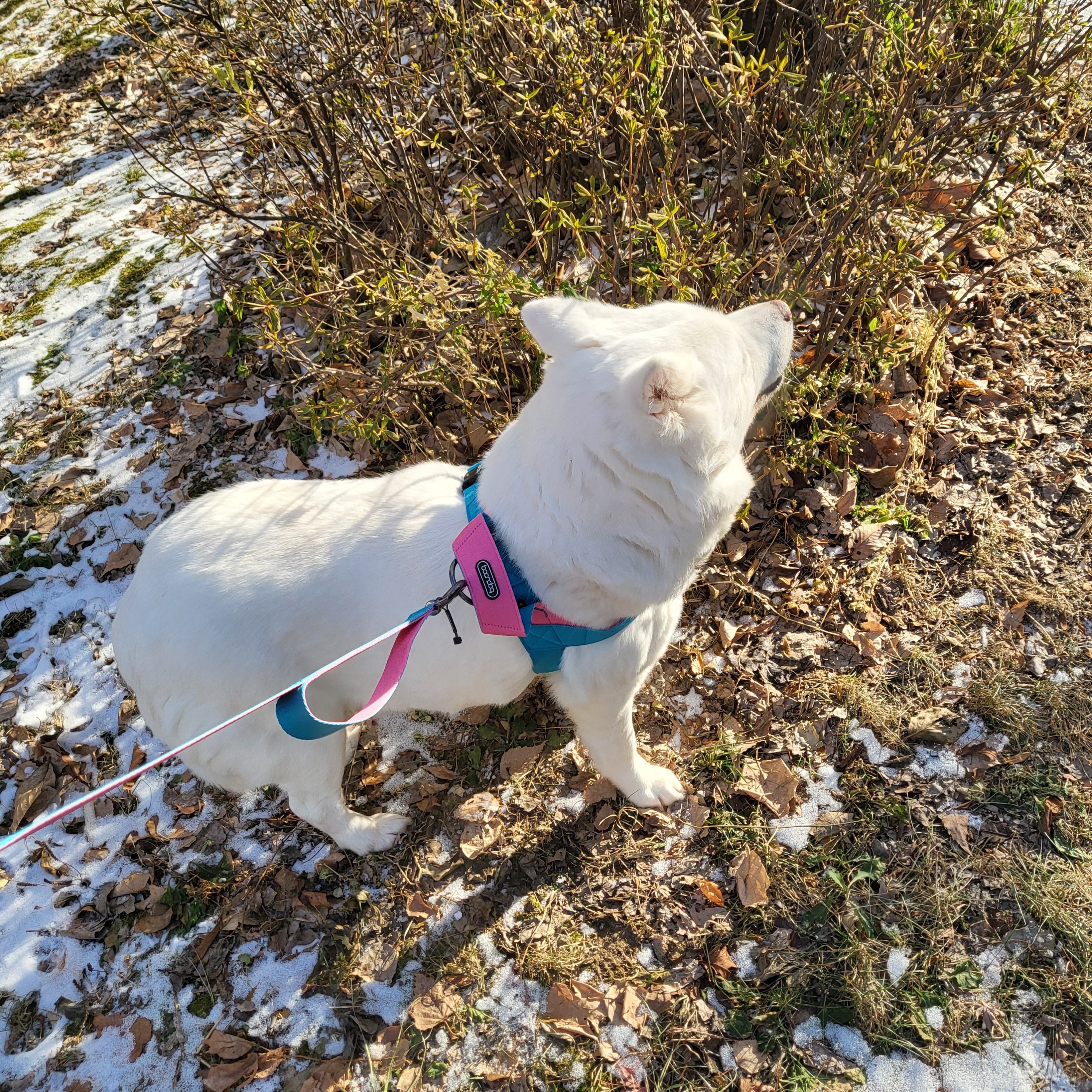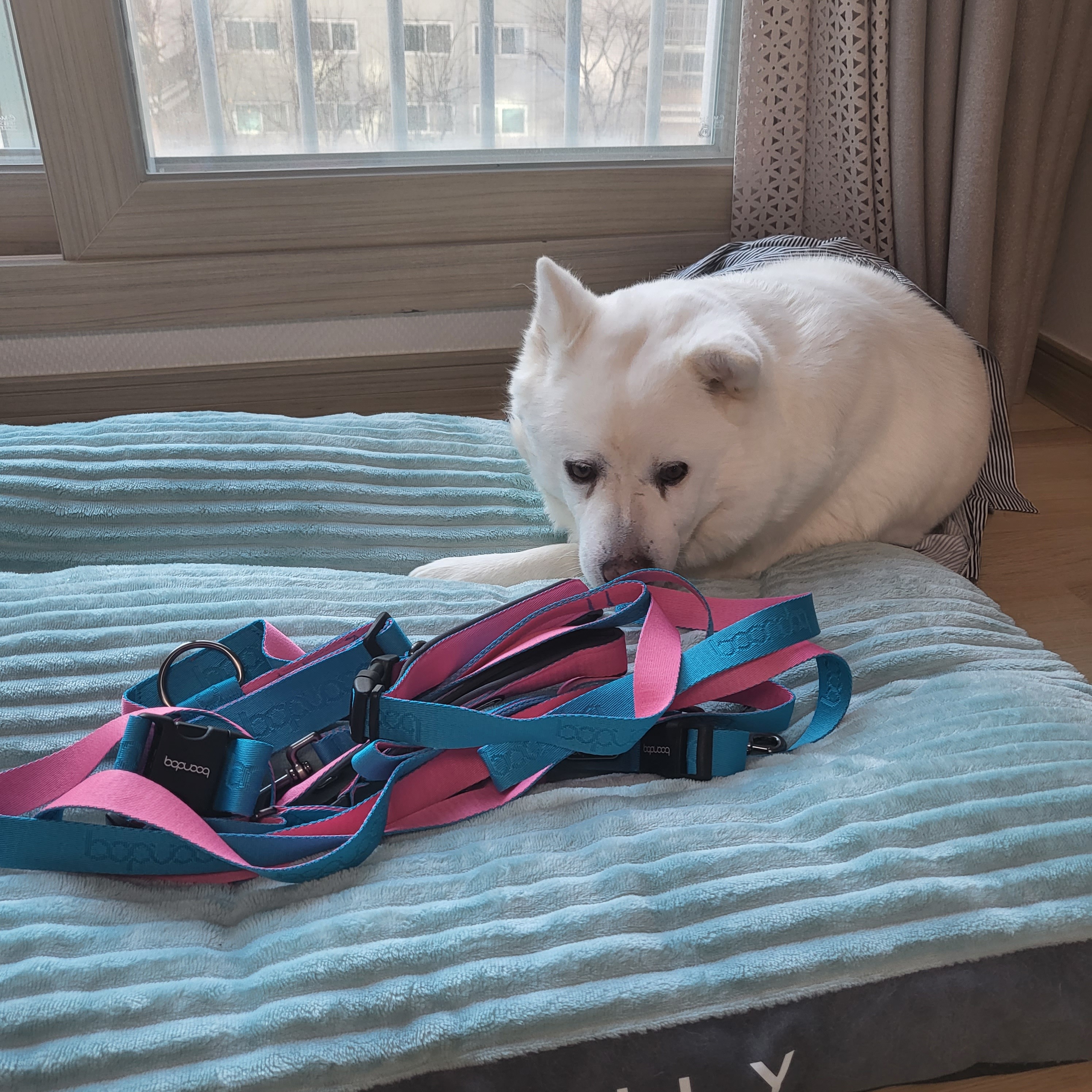 도착한 하네스 킁킁 맡더니 착용도 잘하더라구요