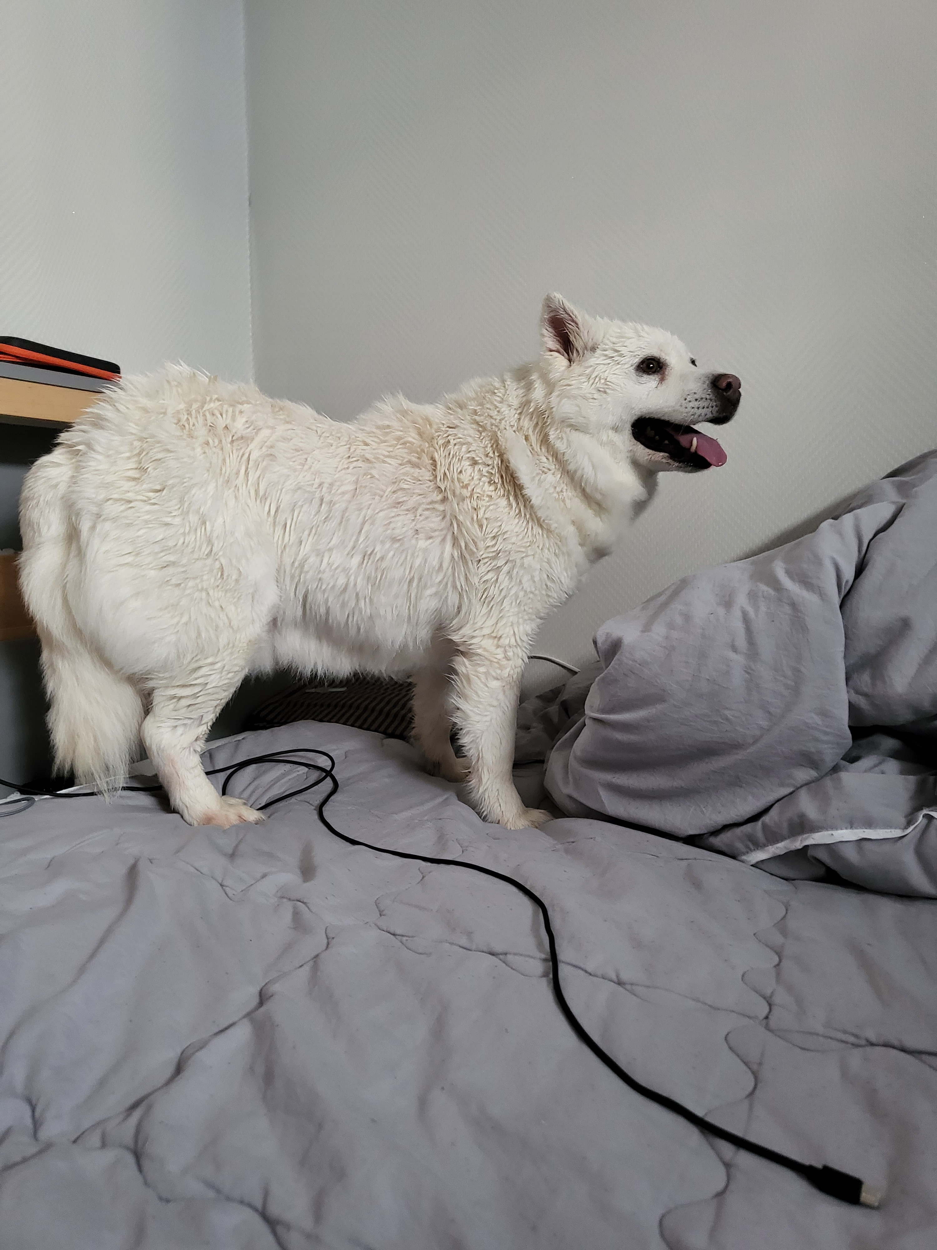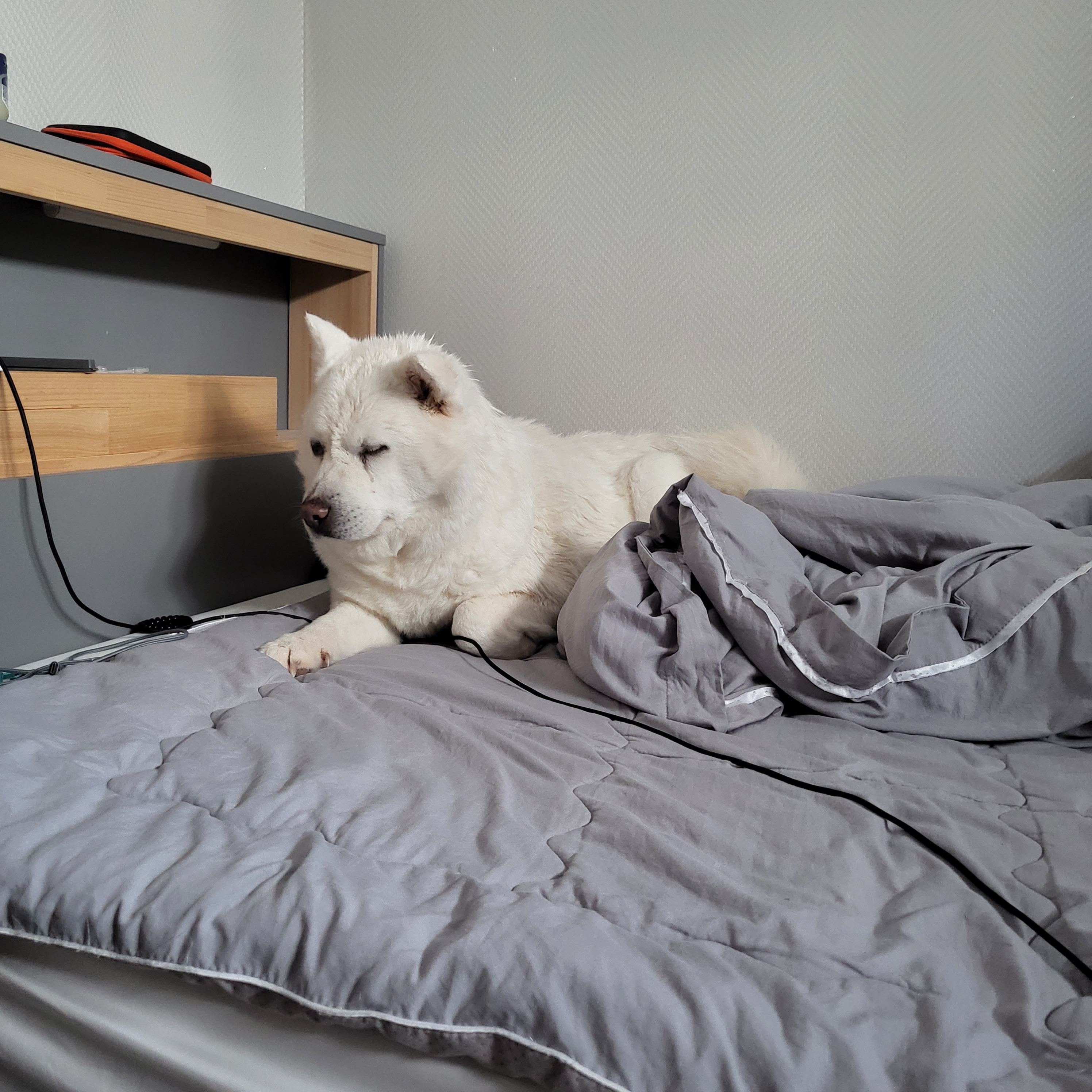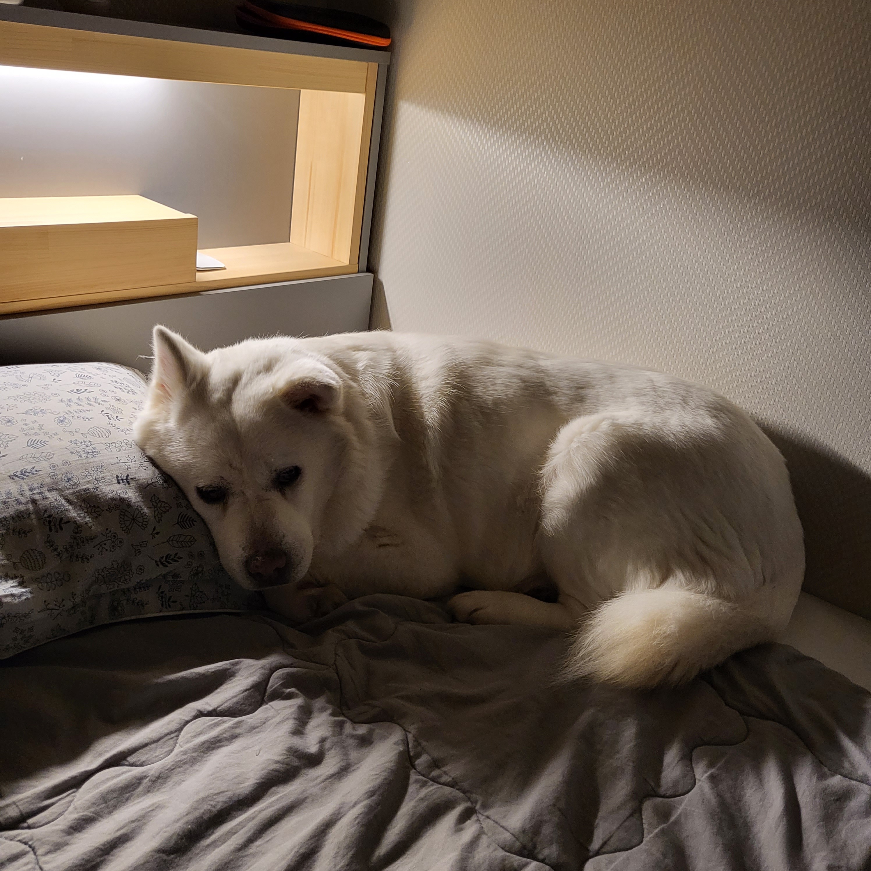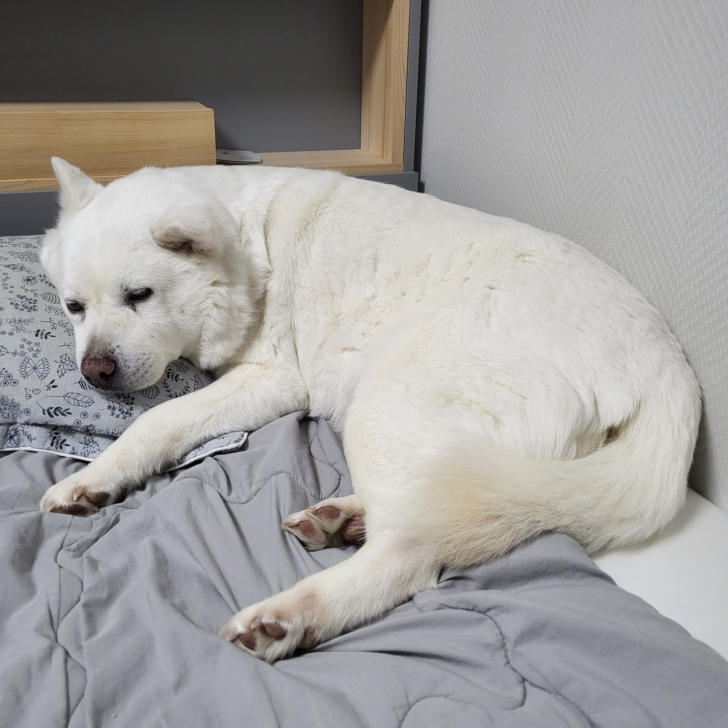 이제 침대에서 내려오지 않는 강아지가 되었답니다...