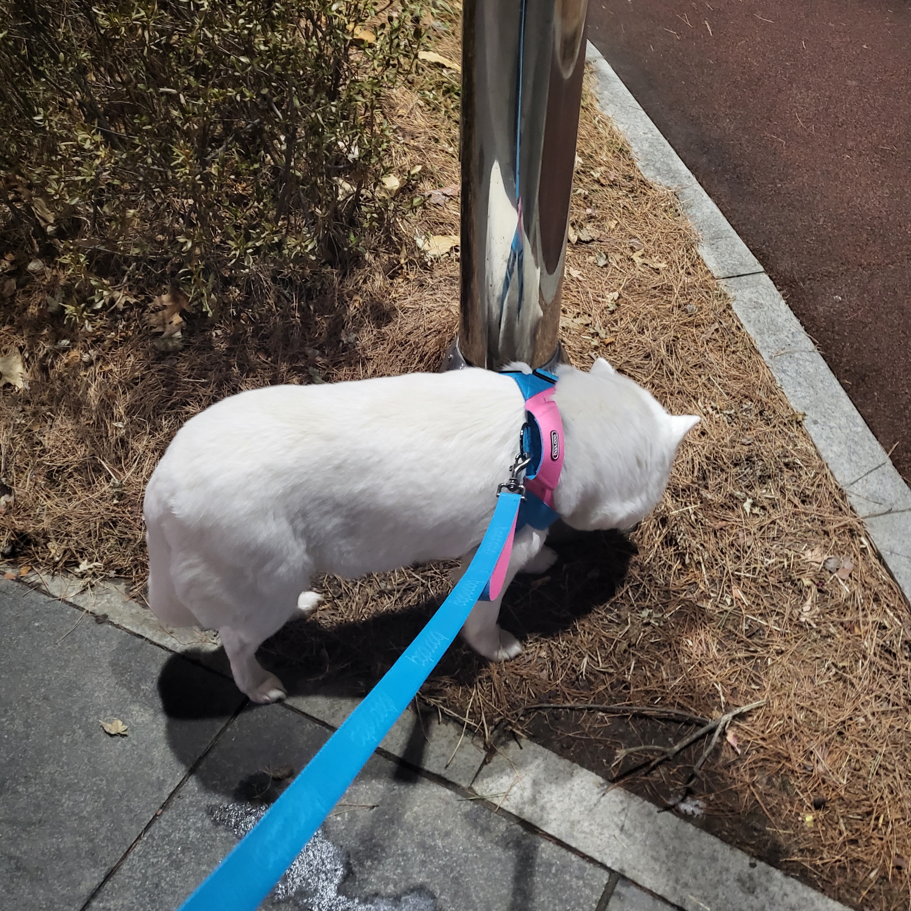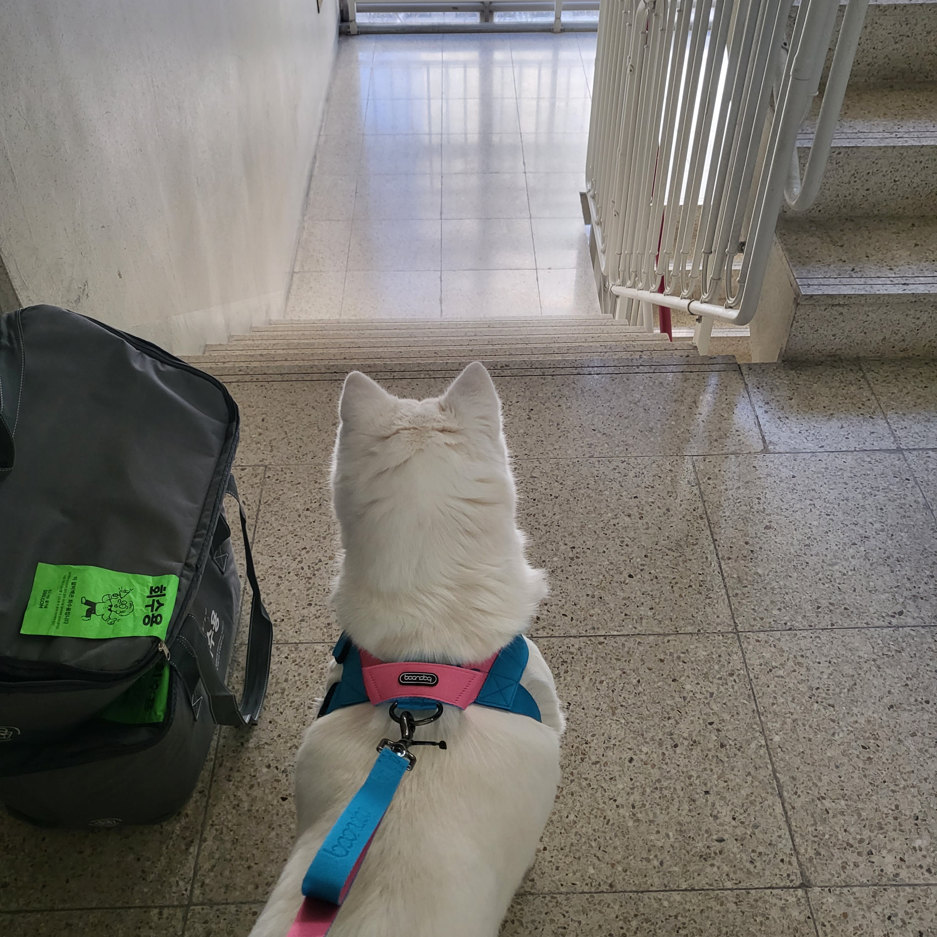 원래 집안 산책만 하려고 했는데 너무 잘 따라오고 현관문을 열어봤더니 나가고싶어해서 허락 받고 하네스 연습 첫날부터 외출