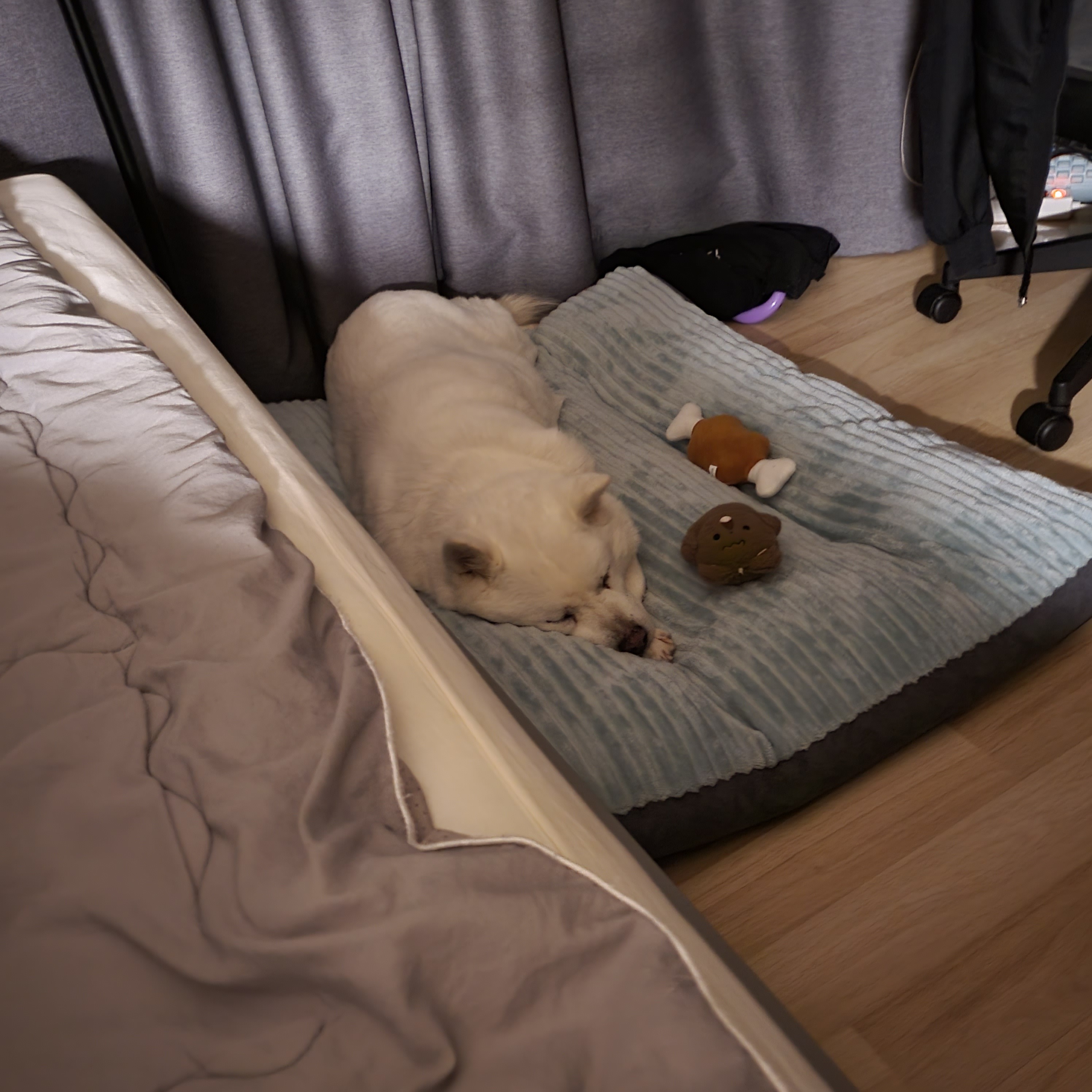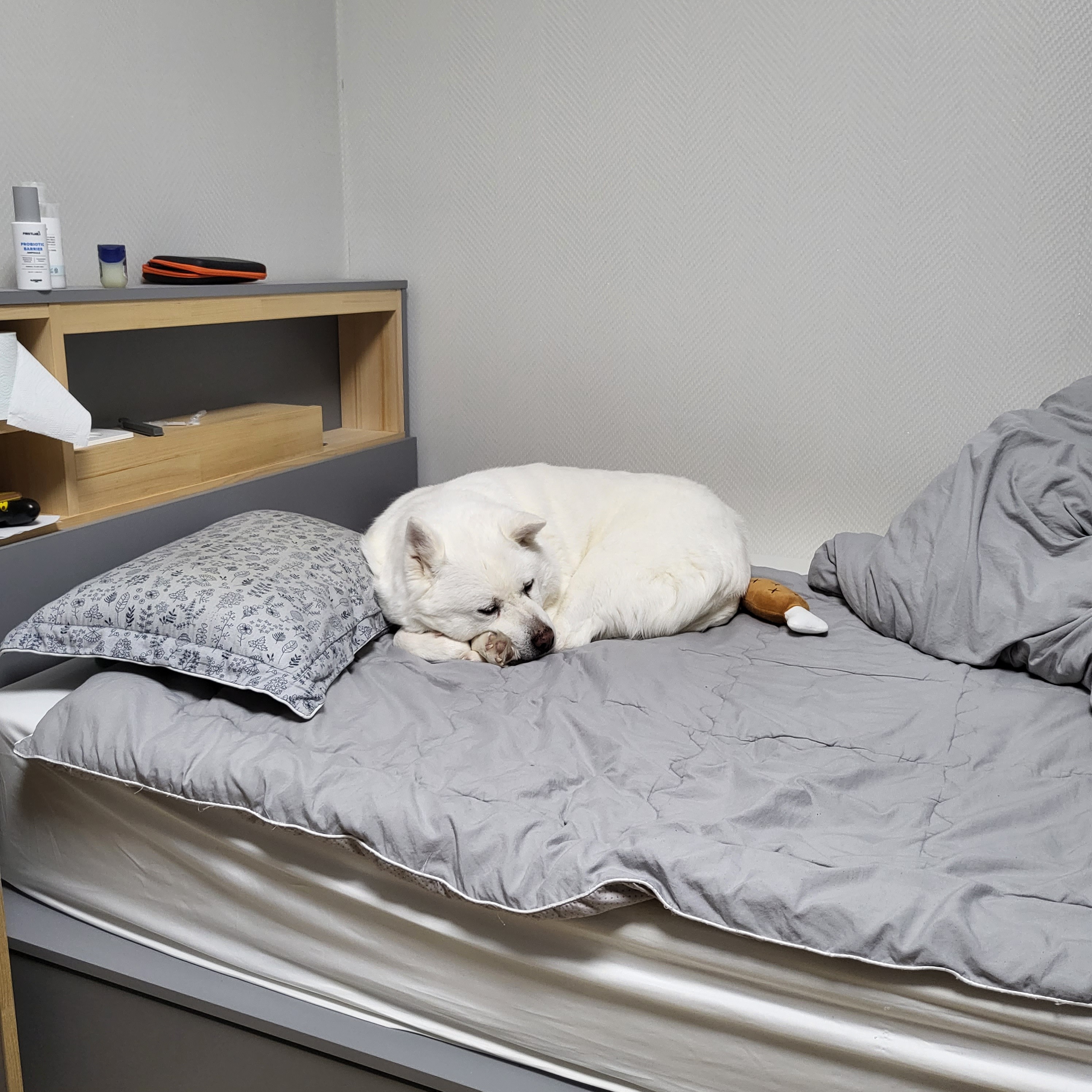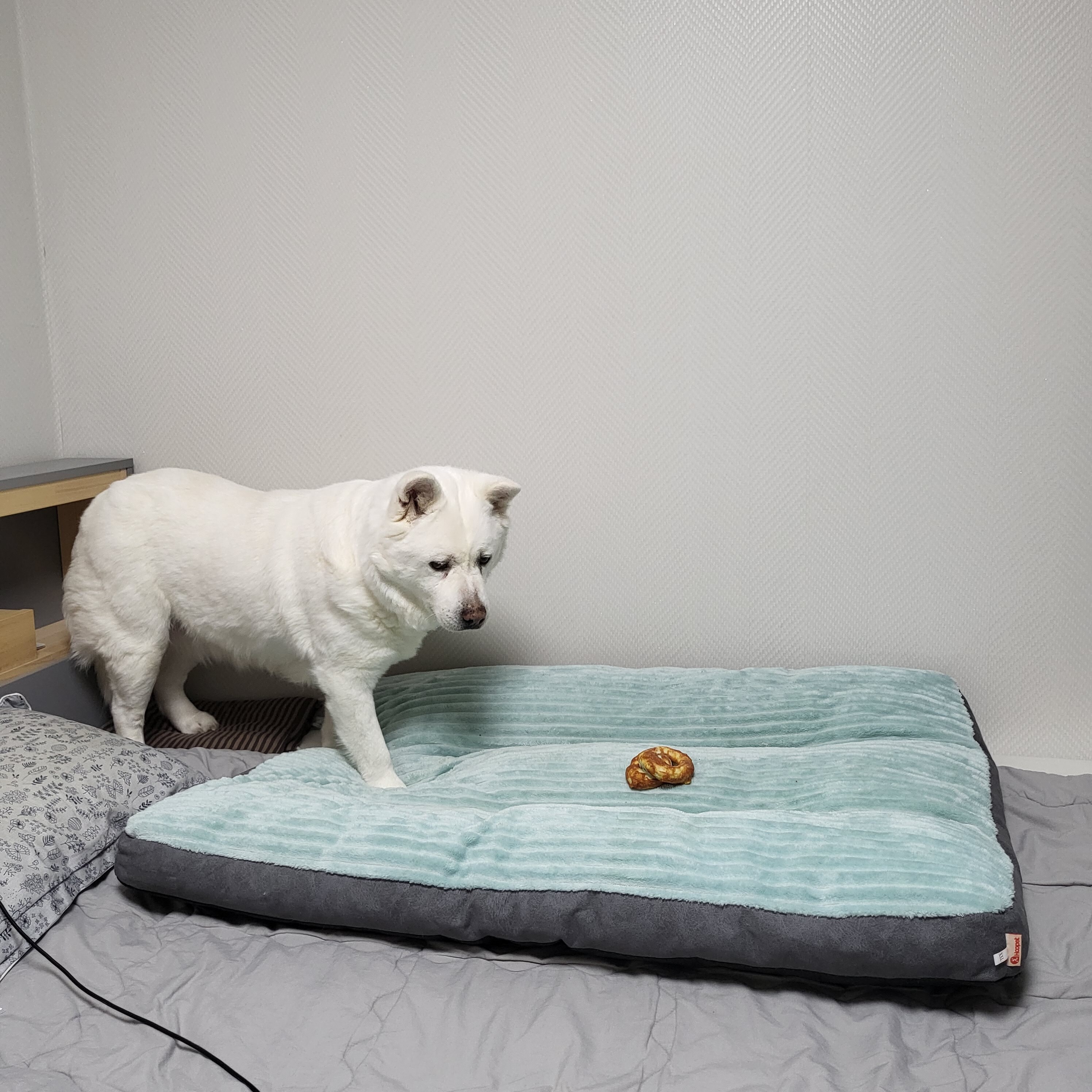 폭신한 침대가 마음에 들었는지 이제 침대에만 집착하는 강아지로 진화했답니다