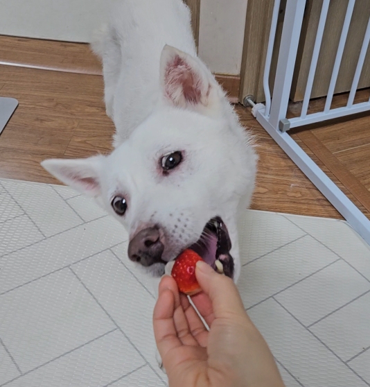 딸기도 너무 좋아하길래 삼촌이 퇴근길에 잔뜩 사 왔어요. 후식으로 한두개씩 주고 있어요.