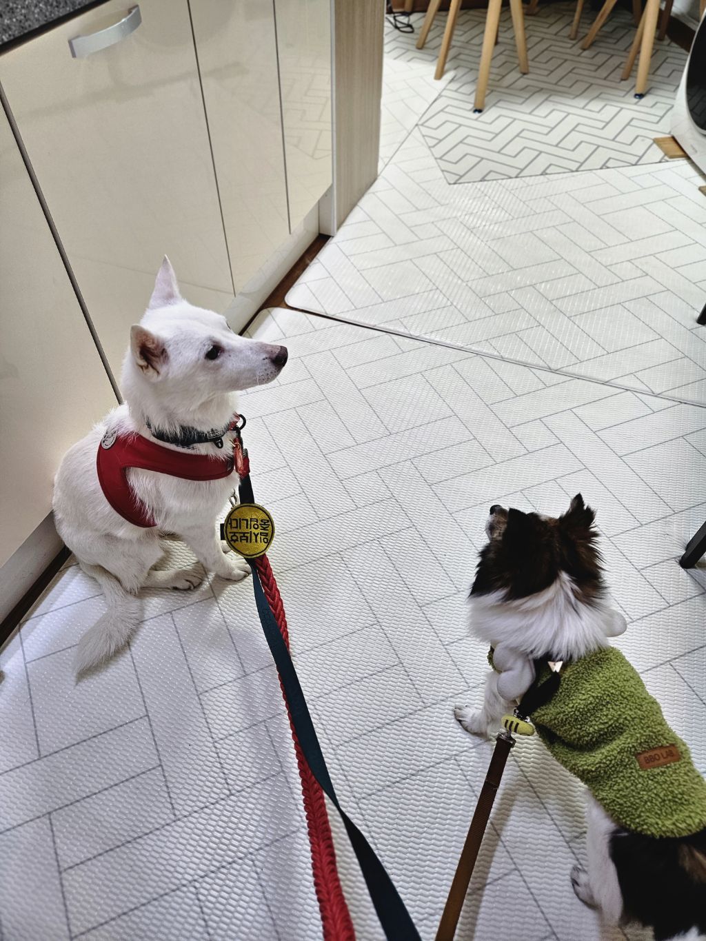산책 후에는 발닦고 들어가는거라고 조금씩 배우는 중이에요. 산책 다녀오면 저렇게 딱 앉아요.아직 발만지면 움찔거리긴 하지만 제법 잘 적응하고 있어요.
