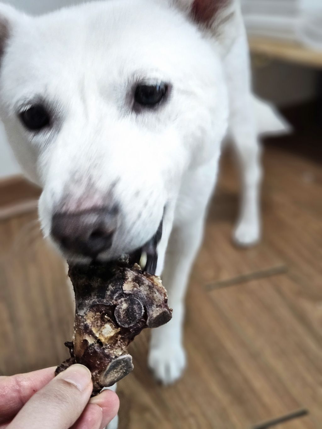 오리목뼈와 돼지등갈비에요. 첨엔 핥기만 하고 먹을 줄 모르나 싶었는데 와드득~거리고 잘 씹어먹어요