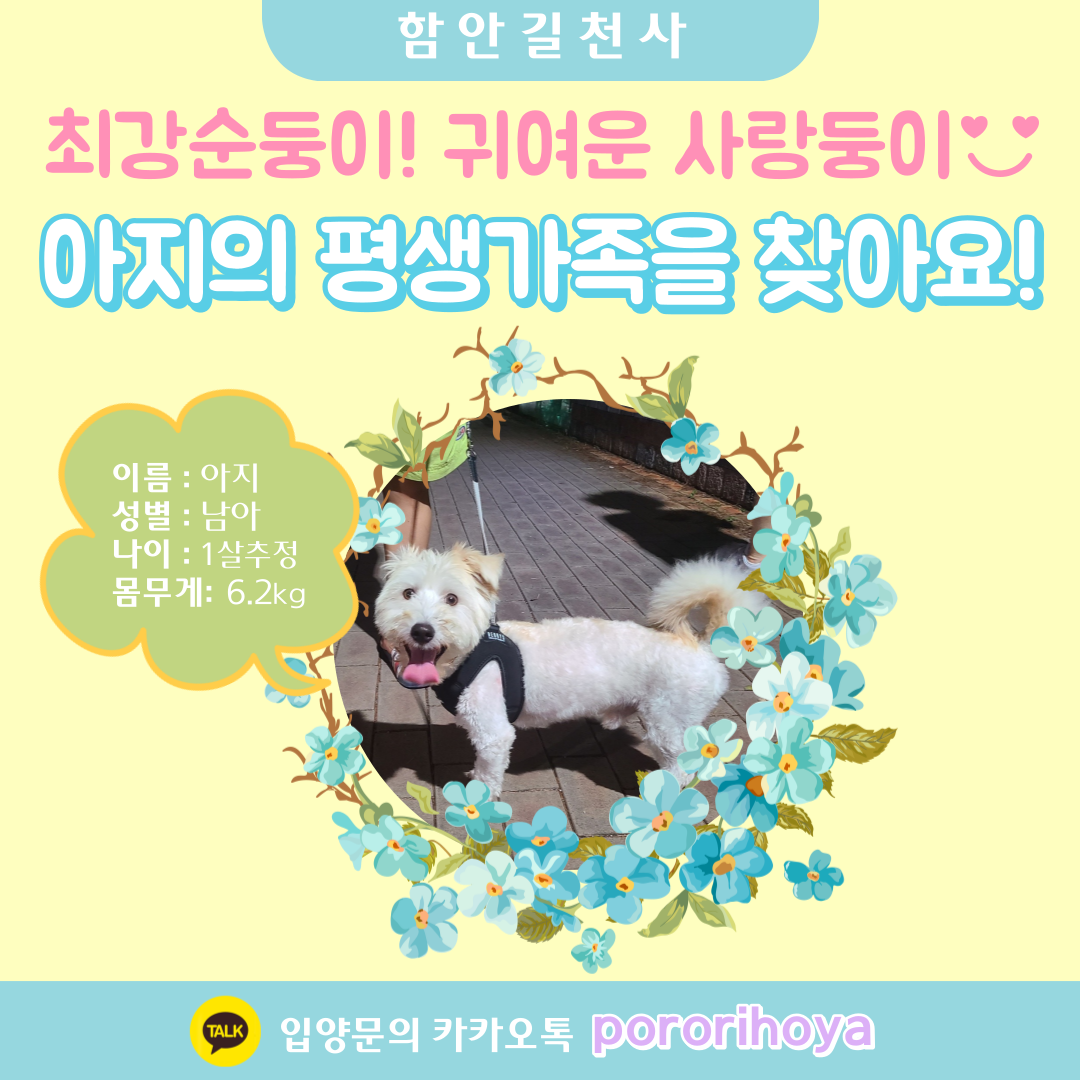 미소가 정말 해맑고 사랑스러운 아지! 씩씩하게 심장사상충 치료도 잘 받고 밥도 잘 먹어 점점 건강해지고 있어요~우리 아지가 힘들었던 과거를 잊고 행복한 삶을 살아갈 수 있도록 옆에서 함께 해주실 평생가족을 찾습니다!