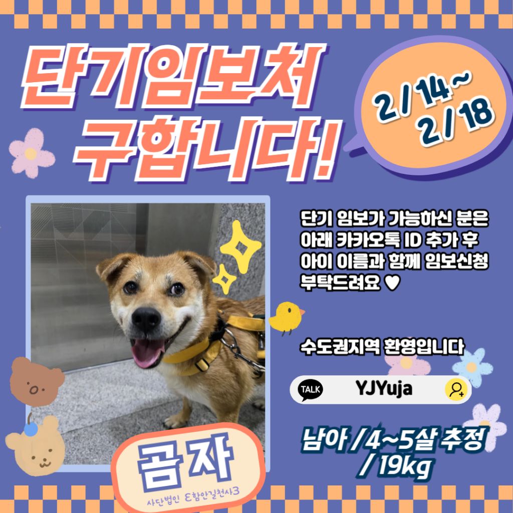 곰자를 단기 임보해 주실 수 있는 분이 계시다면 단기임보 신청 부탁드려요♥
