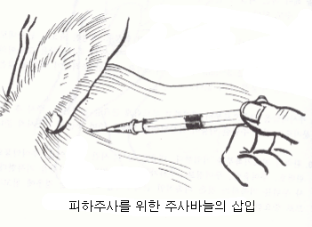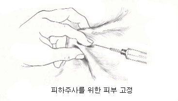 그림1) 에서 보는 것처럼 목부위, 어깨부위, 허리부분 등의 잘 늘어지는 부위를 엄지와 다른 손가락을 이용한 피부를 들어올려 주사바늘을 엄지쪽의 들어올린 부위에서 반대쪽으로 바늘을 자입하되 바늘의 기저부가 피부에 접촉 되도록 한다.