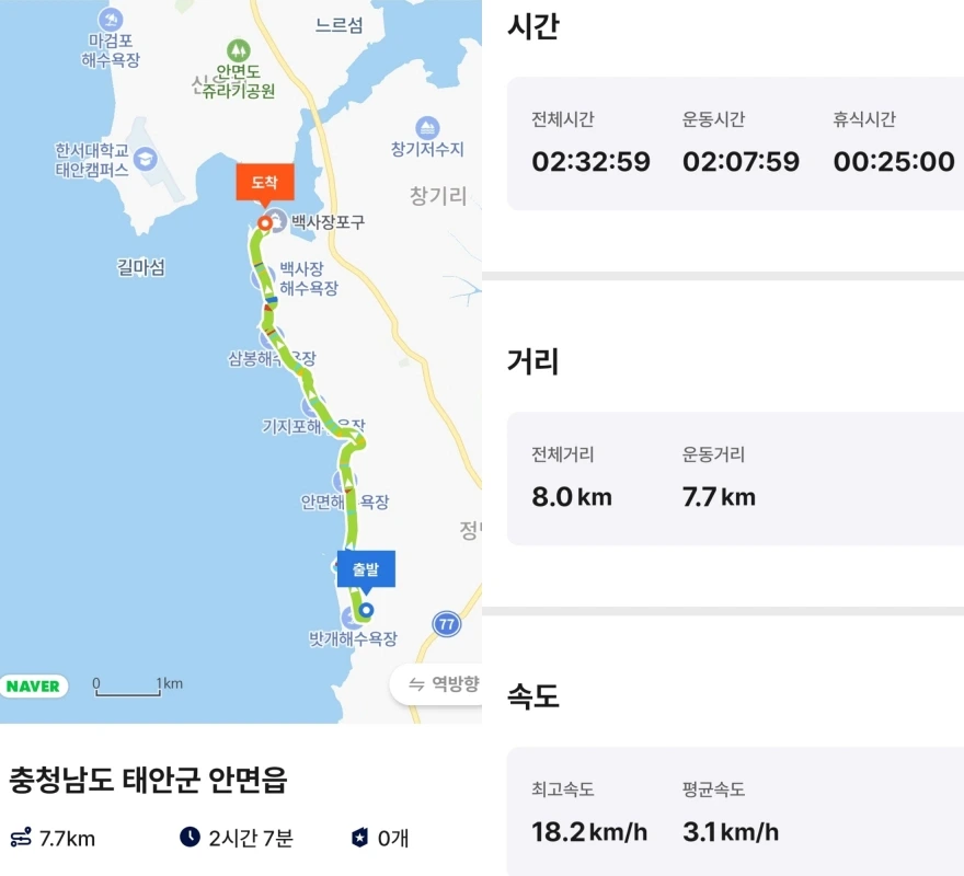 3. 산행코스 : 밧개해수욕장-두여해수욕장-상봉해수욕장-백사장해수욕장-백사장항(8km)