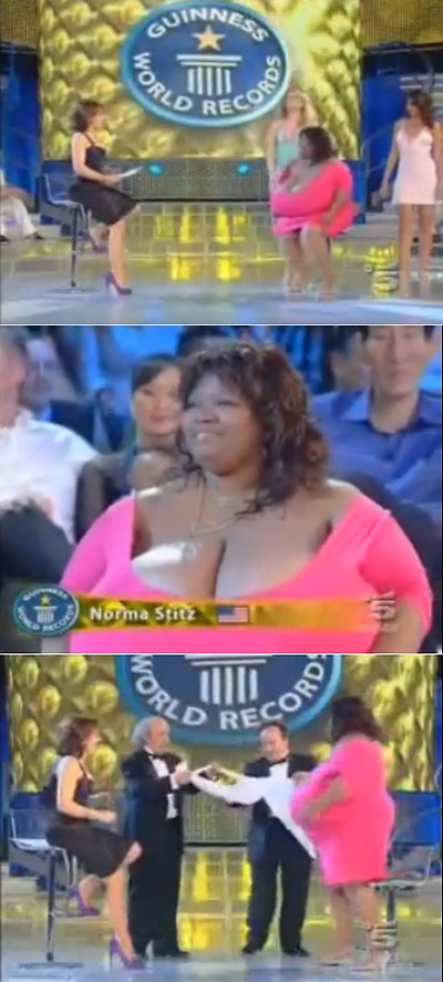 세계에서 가장 큰 가슴을 가진 여성으로 기네스북에 오른 미국 여성 노마 스티츠(Norma Stitz·50)가 최근 기네스북에서 실시한 한 쇼에 출연하며 화제가 되고 있다.