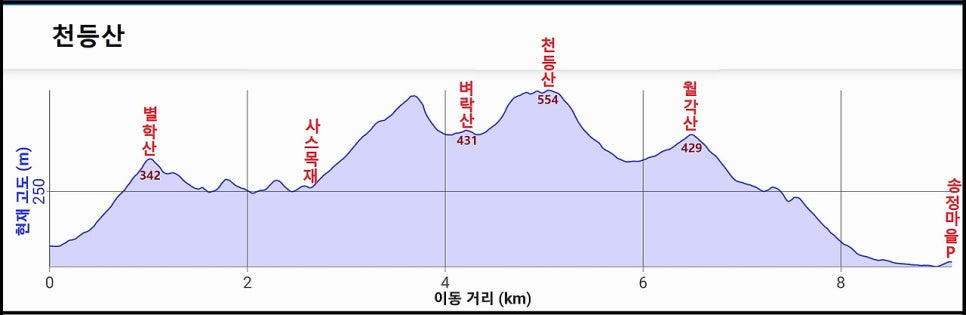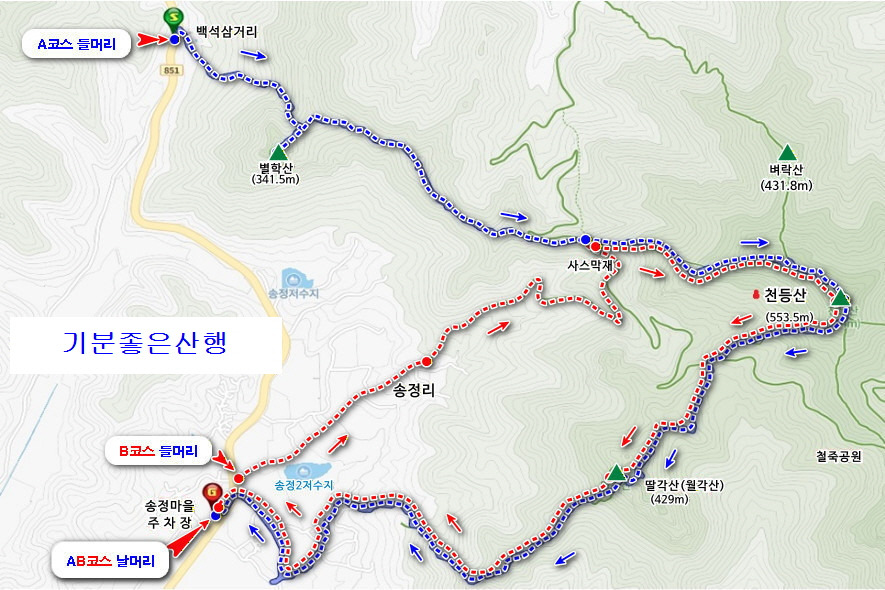 | 산행코스 | 백석삼거리-별학산-사스막재-벼락산왕복-천등산-월각산-송정마을(11.5km 5시간) | ||