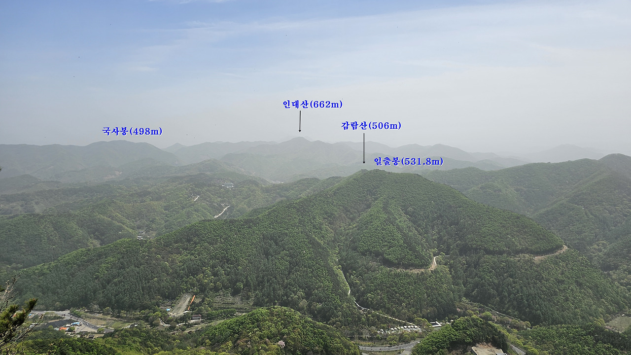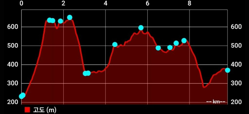 | 산행코스 | 이치대첩지-오대산-일대봉-배티재-극기봉왕복-감람산-일출봉-7봉-배티재 (10.5km 4.5시간) B코스: 배티재-극기봉왕복-감람산-일출봉-7봉-배티재(7.5km 3시간) | ||