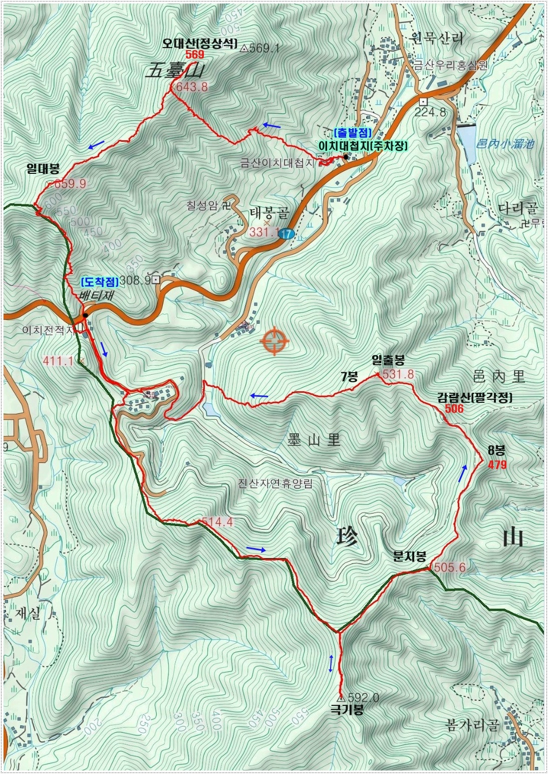 오대산은 충남 금산군 진산면에 있는 산으로 높이는 663m이다. 금산의 명산으로 꼽는 산이다. 산봉우리 다섯 개가 뚜렷이 구별된다 하여 붙여진 이름이 오대산이다. 태고교 입구에서 시작하여 정상을 지나 배티재까지 능선을 타고 오르내리며 다섯 개의 봉우리를 넘는 구간이 이어진다.오대산의 하산이 시작되는 배티재에는 대둔산을 한눈에 조망해 볼 수 있는 전망대가 설치되어 있다. ‘이치(梨峙)’는 ‘배티재’의 또다른 이름으로 대둔산 중허리를 넘어 충남 금산과 전북 완주를 연결하는 교통의 요지이자 전략상 중요한 곳으로 임진왜란 때 ‘이치전투’가 있었던 곳이다. 경상도와 충청도를 휩쓴 왜군이 군량미의 현지 보급을 위해 호남평야로 진출하려고 했을 때 권율 장군이 동복현감 황진과 군사들을 이끌고 이치를 지켜 왜군의 호남진출을 막았다.‘이치대첩’은 행주대첩·진주대첩보다 앞서 임진왜란 최초의 육지에서 승리한 싸움이다. 이번 산행의 시작은 이치대첩지와 권율장군 사당이 있는 충장사를 거쳐 오대산으로 오른다. 충남 금산군 진산면에는 ‘대둔산자연휴양림’으로 더 잘 알려진 ‘진산자연휴양림(珍山自然休養林)’이 있다. 휴양림에서 명명한 극기봉(592), 일출봉(531.8), 감람산(506), 그리고 7·8봉이 있다. ‘극기(克己)’는 자기를 눌러 이기는 이름이고, ‘일출(日出)’은 해가 뜨는 것, ‘감람(橄欖)’은 성경에 나오는 이름으로 감람나무를 말한다.
