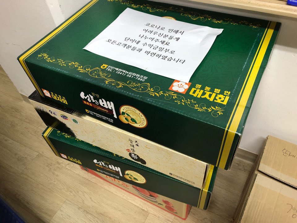 배 3박스와 사과 1박스, 그리고 건강지킴 마스크와 손세정티슈를 후원해주셨습니다.