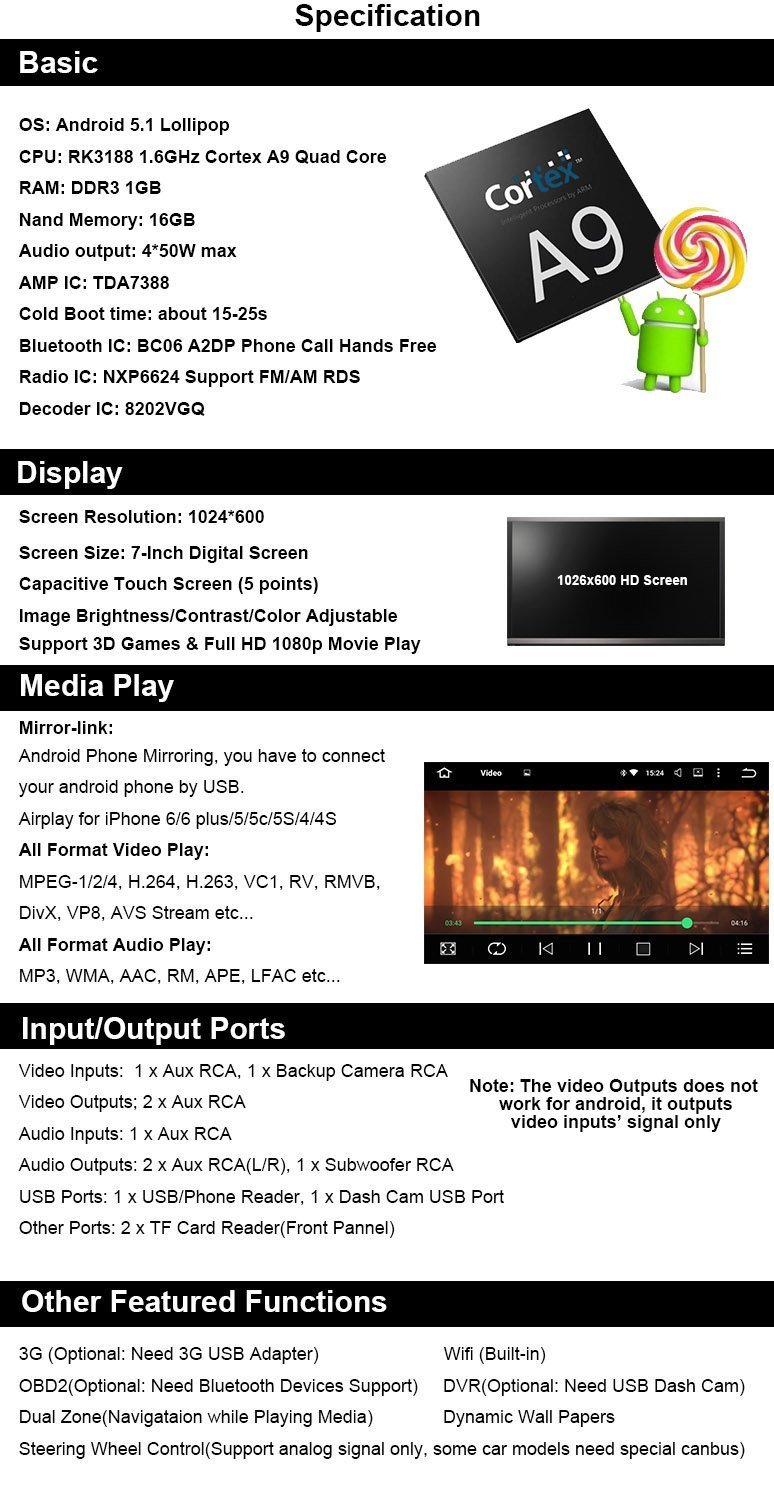 Optional(Need additional devices) support for 3G USB Adapter, DVR USB Dash Cam, Tire Pressure Bluetooth Reader, OBD2 Code Bluetooth Reader, Bluetooth Adapter, DAB/Digital TV box.