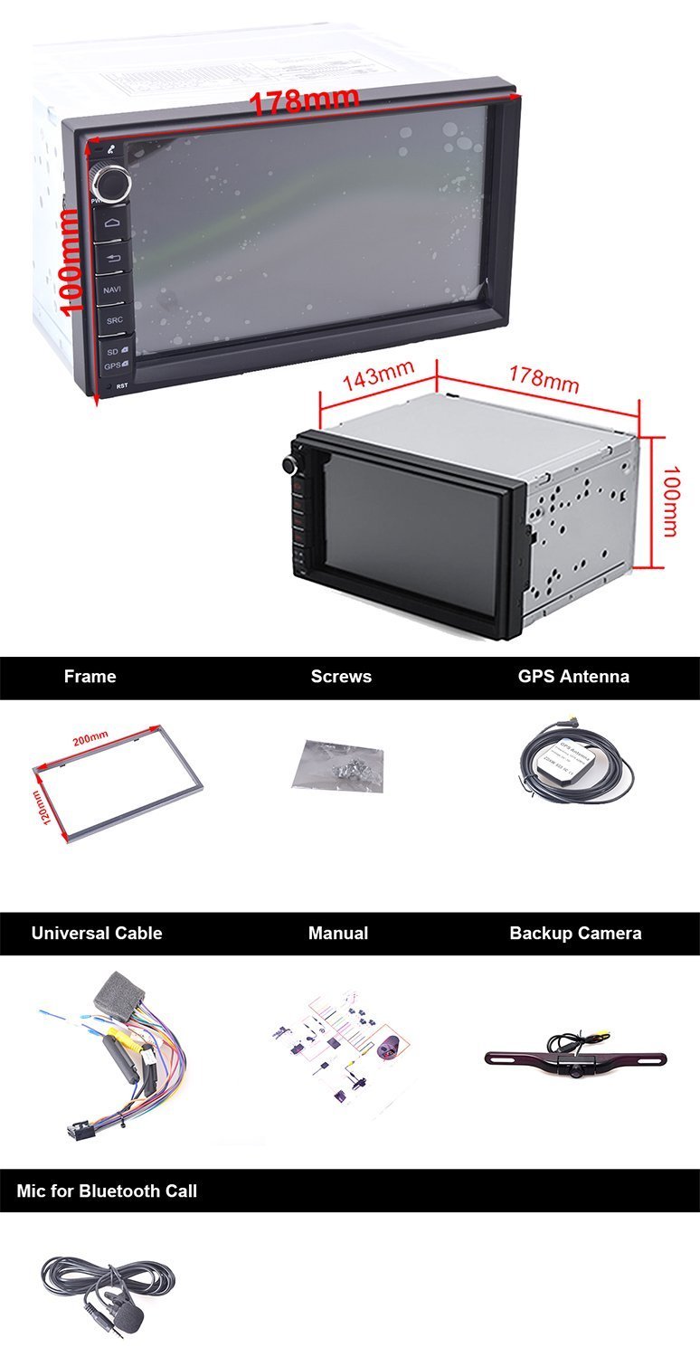 - Standard universal double din in-dash head unit(178x100mm) with ISO cable harness. Please mind your car dash hole size before placing order and feel free to contact us if you have any questions. We offer 2-year warranty. For more Radio Antenna Adapters, please search ASIN code: B01CFKU6WO, B01DF3JRZ2. Bluetooth OBDII Adapter:B01KXJ1P38. DVR Camera:B01KXJ1KPQ. DC 24V to 12V Converter: B01EFUHFDU