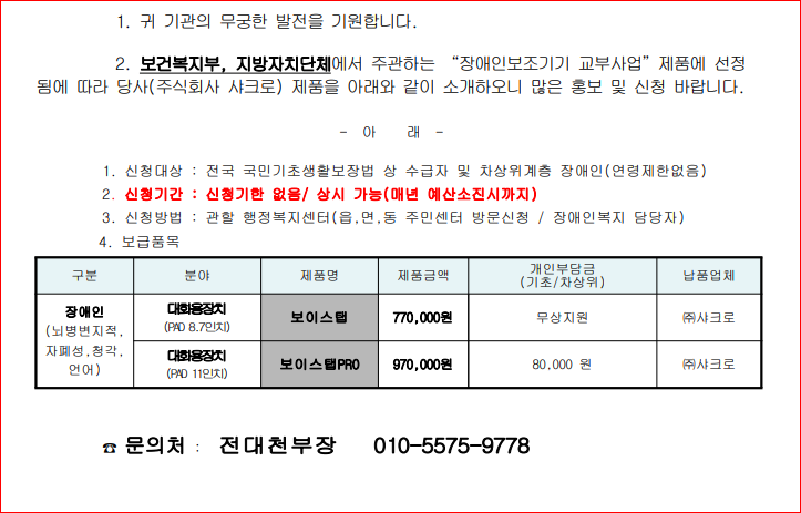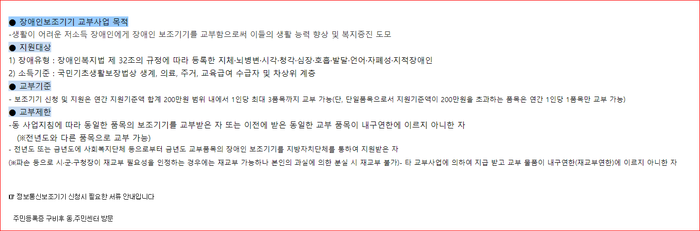 장애인보조기기 교부사업 안내 작성자경남지적발달장애인복지협회|작성시간24.07.22|조회수54 목록 댓글 0 글자크기 작게가 글자크기 크게가 장애인보조기기 교부사업_필요서류.pdf107.14KB 첨부파일첨부된 파일이 3개 있습니다. png 파일 image.png 다운로드 png 파일 image.png 다운로드 pdf 파일 장애인보조기기 교부사업_필요서류.pdf 다운로드 다음검색 현재 게시글 추가 기능 열기 북마크 신고 센터로 신고 댓글 댓글 0 댓글쓰기 답글쓰기 댓글 리스트