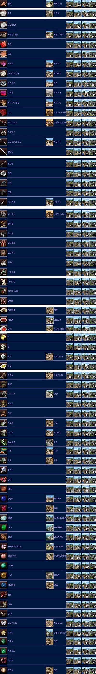 위에서 부터 차례대로 식료품, 조미료, 의약품, 잡화, 주류, 염료, 광물, 공업품에서 제가 쓸만하다 싶은걸 따로 뺀겁니다.